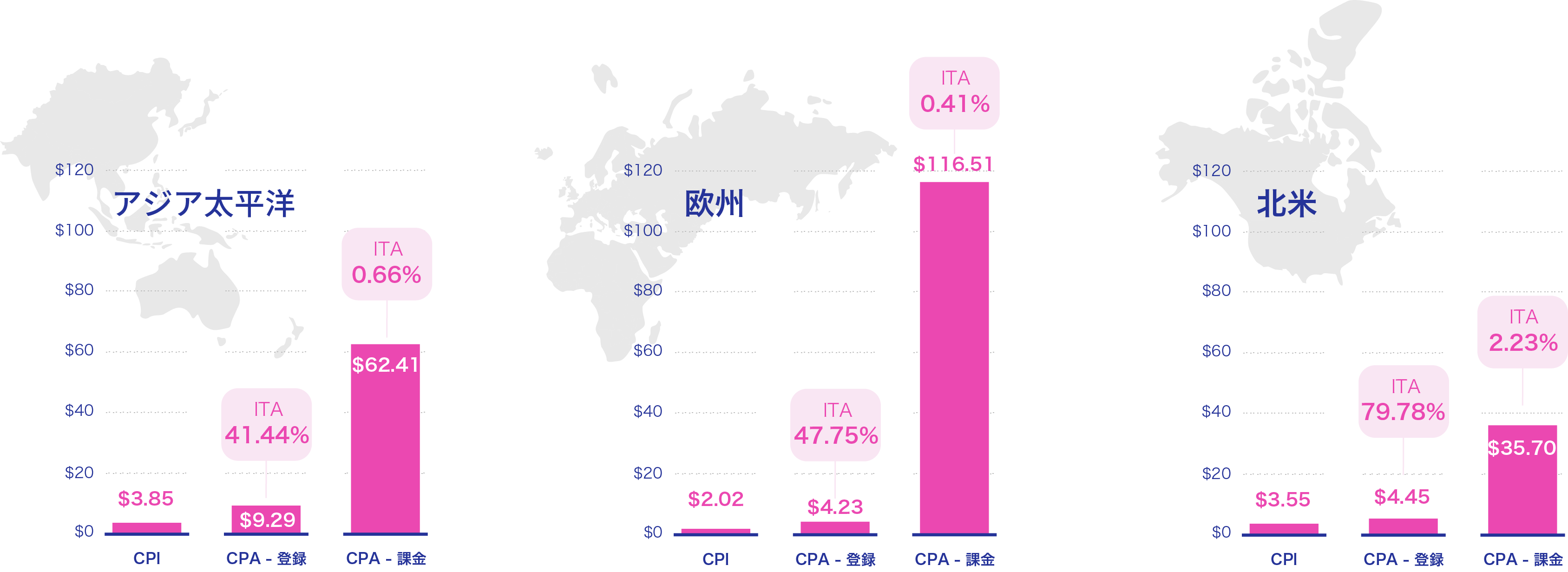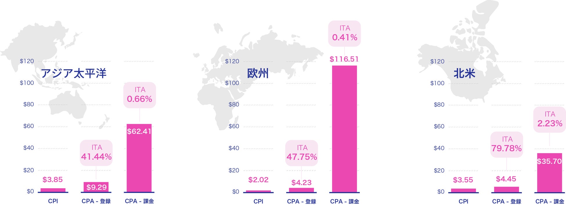 - 地域別の傾向 - インストール単価は欧州マーケットが安く、課金率は北米が高い