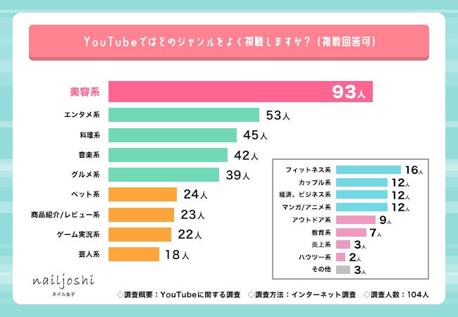 そこで今回、『ネイル女子』(https://www.nailjoshi.com/)を運営するアウトオブザボックス株式会社は、美容に興味があってYouTubeを見る20〜30代の女性104名を対象にYouTubeに関する調査を実施しました。