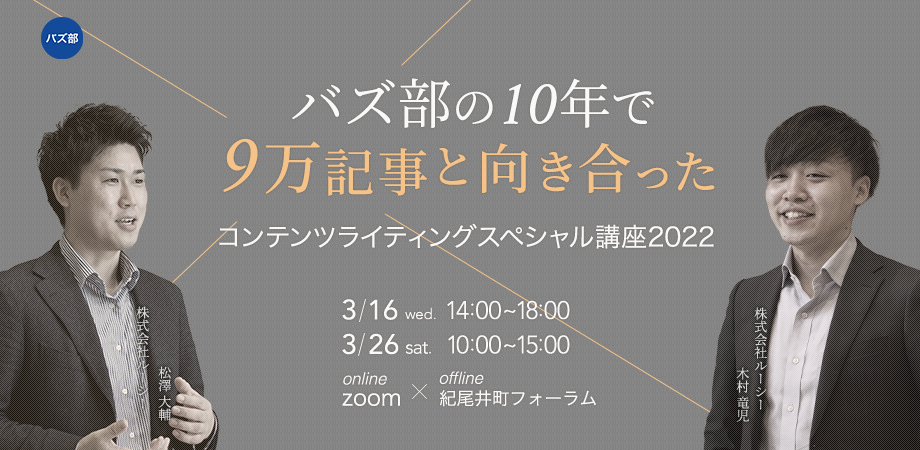 2022年3月16日(水)・26日(土)に「バズ部式コンテンツライティングスペシャル講座」を開催することを決定いたしました。