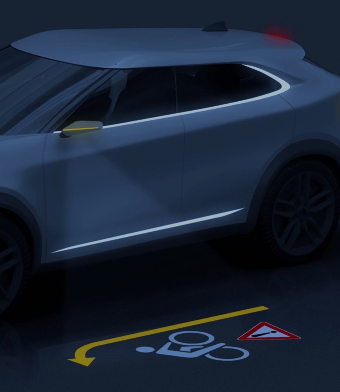 マレリの近接地面投影は、地面に動的なカラー投影を可能にします。それぞれのモジュールが車両の前、後ろ、側面に取り付けられることで、360度の照明効果を作り出します。この革新的な技術は、車両の安全性を大幅に向上させ、車両、利用者、他の交通参加者の間の相互対話を大いに改善します。安全性の面では、車両の動作(曲がる、バックする、緊急ブレーキ、乗客の降車など)について、周囲の車両や歩行者の注意を喚起するために、リアルタイムで明確なカラー警告標識を投影できます。スマートな相互対話の面では、自動運転の状況、バッテリーの状態、走行可能距離、オーナーの連絡先情報を含む個人QRコードを動的にリアルタイムで表示し、利便性と直感的な相互対話を向上させます。カスタマイズの面では、ウェルカム・ライト・カーペットをサポートし、映画やインタラクティブ・ゲームを投影することも可能で、パーソナライズされた車両の表現や車内エンターテインメントの需要に応えます。