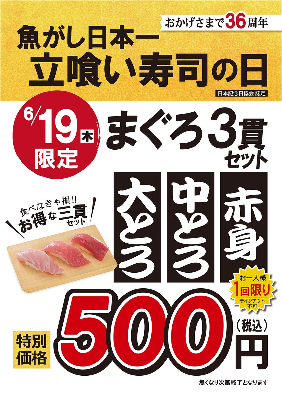 【創業36周年】全国の店舗でまぐろ3貫セットを特別価格で提供 | 6月19日は「魚がし日本一 立喰い寿司の日」