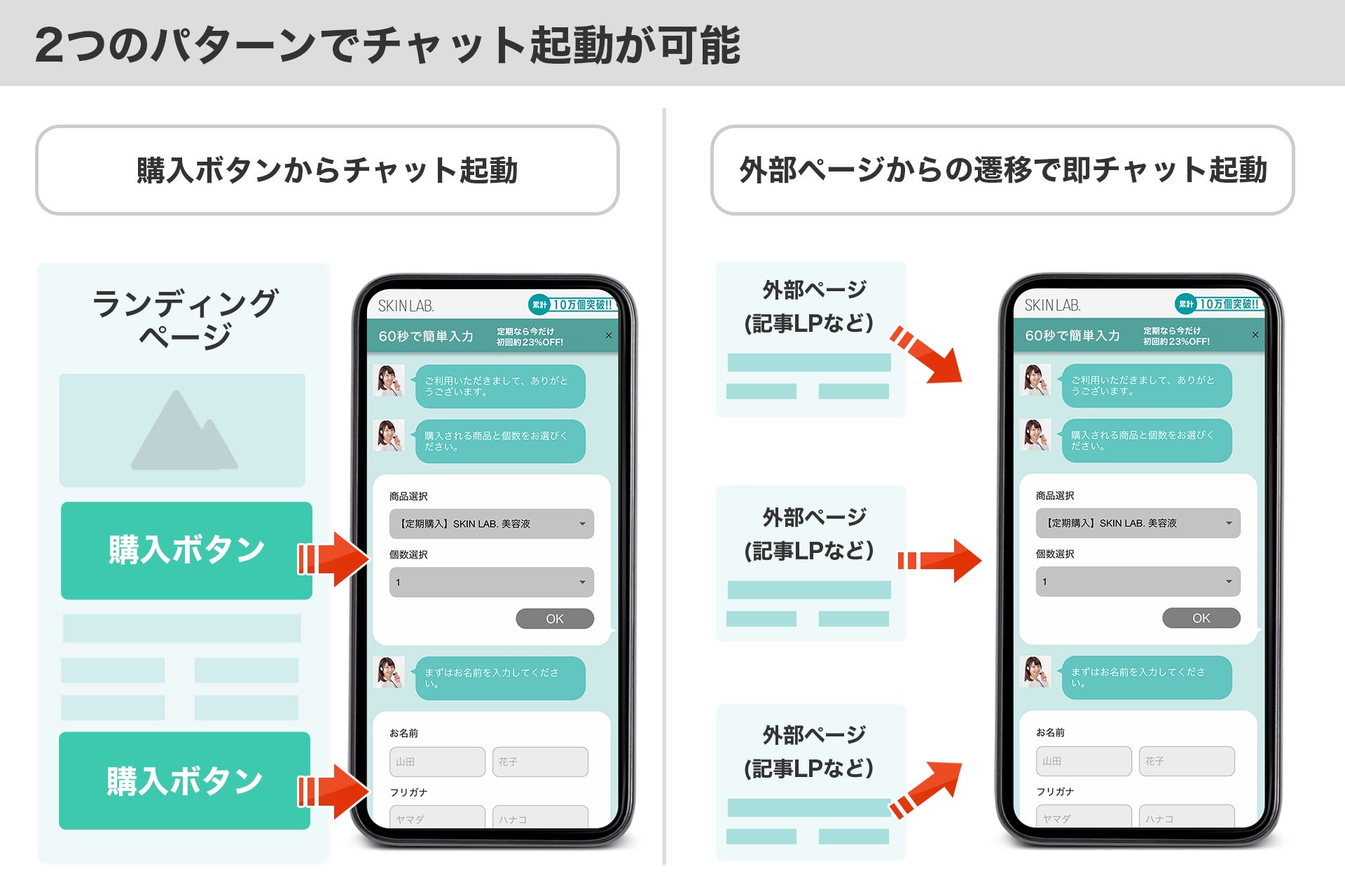 ランディングページにて購入ボタンをクリックしてからチャットを起動させることはもちろん、外部リンクから遷移した際、そのまますぐにチャットを起動することも可能。これにより、ランディングページの代わりにチャット上で商品説明を行い、消費者がそのままチャット形式で購入することも可能になります。