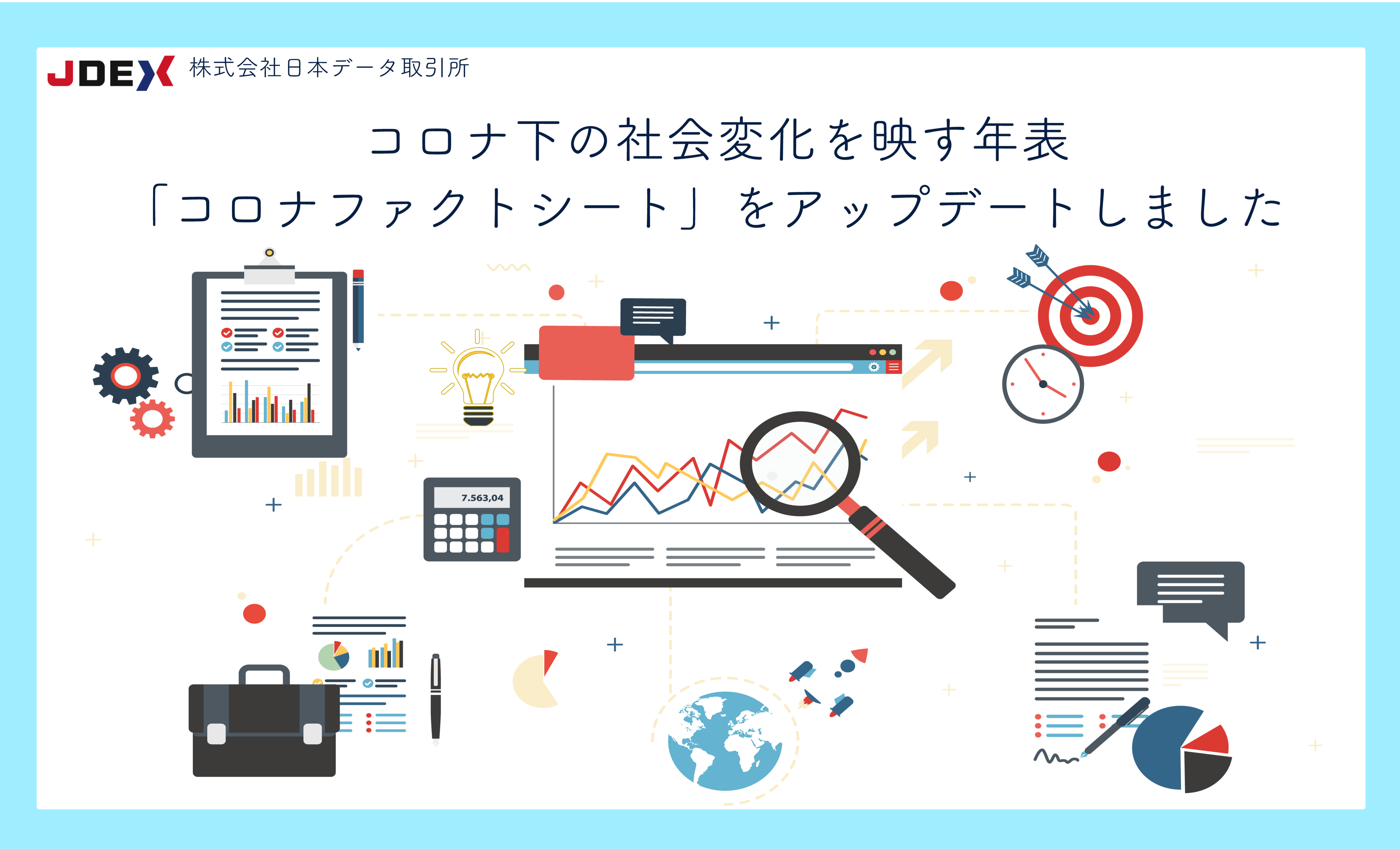 「新型コロナウイルス感染症ファクトシート」は、新型コロナウイルス感染症(COVID-19)による日本社会の変化がたどれる年表です。年表とグラフで構成した本紙(PDF)と、元データや参考文献をまとめたデータセット(Excel)から成り立ち、JDEX会員に無料で提供しています。