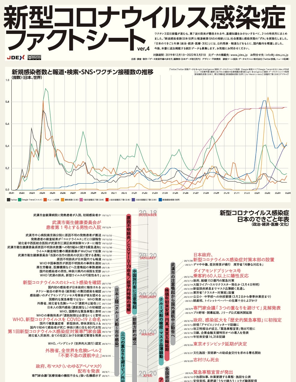 バージョン4は「日本のできごと年表」に2022年1月から3月末までの最新トピックを追加。グラフにも最新のデータを加えました。第6波に翻弄される日本社会が概観できます。