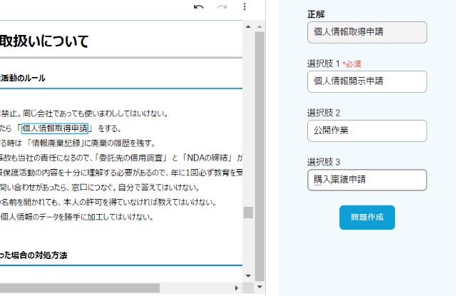 文書を登録、問題を作成して従業員にテストを受検させたい場合は、下記ページのフォームから「問題作成を試す」からご登録をお願いいたします。期間限定のアカウントを発行し、サービスを無料でお試しいただけます。