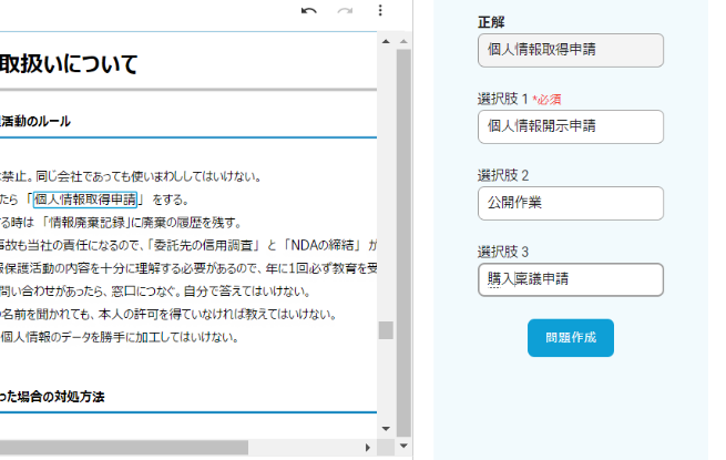 - 就業規則などの理解度を確認したいが、新たに資料やテストを作成する手間を考えるとおっくうになる。
