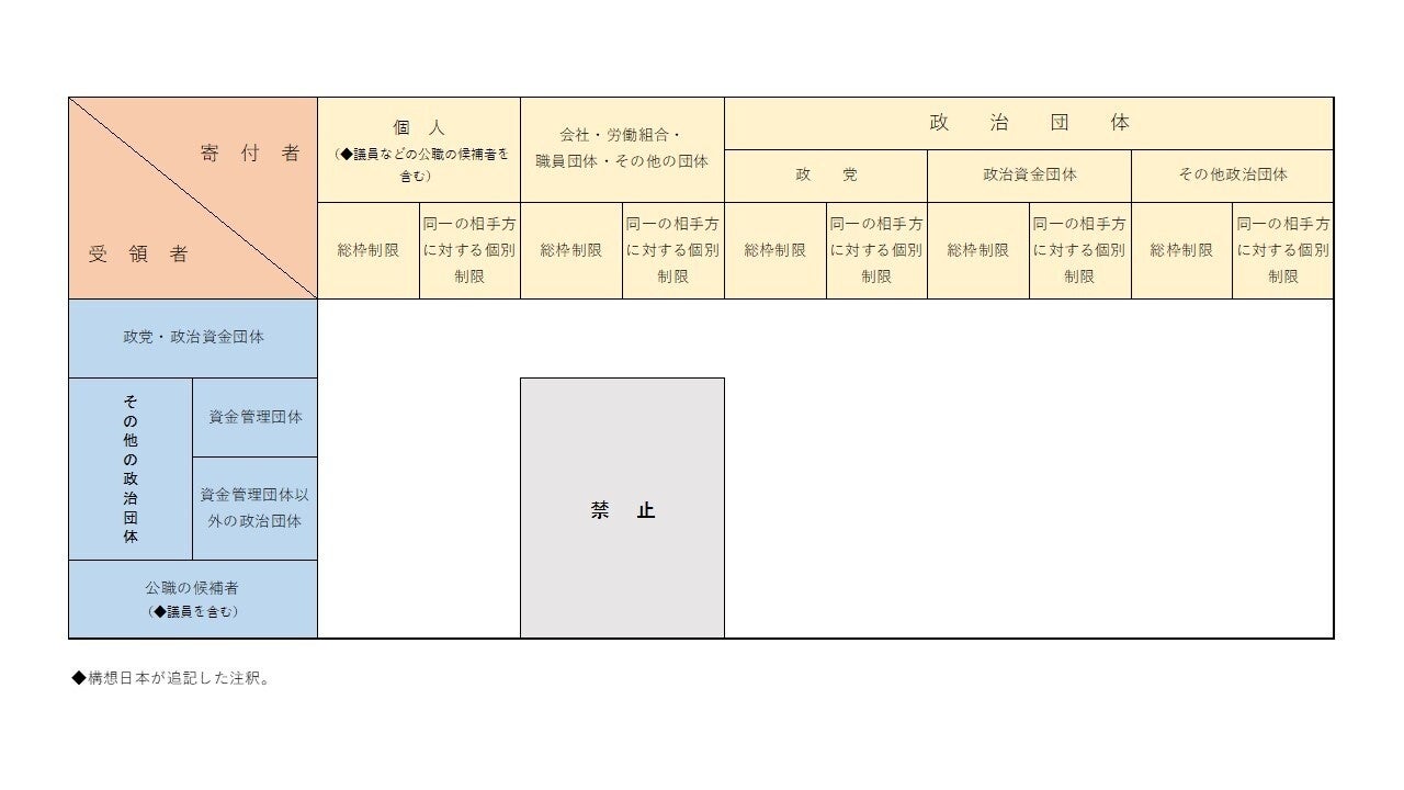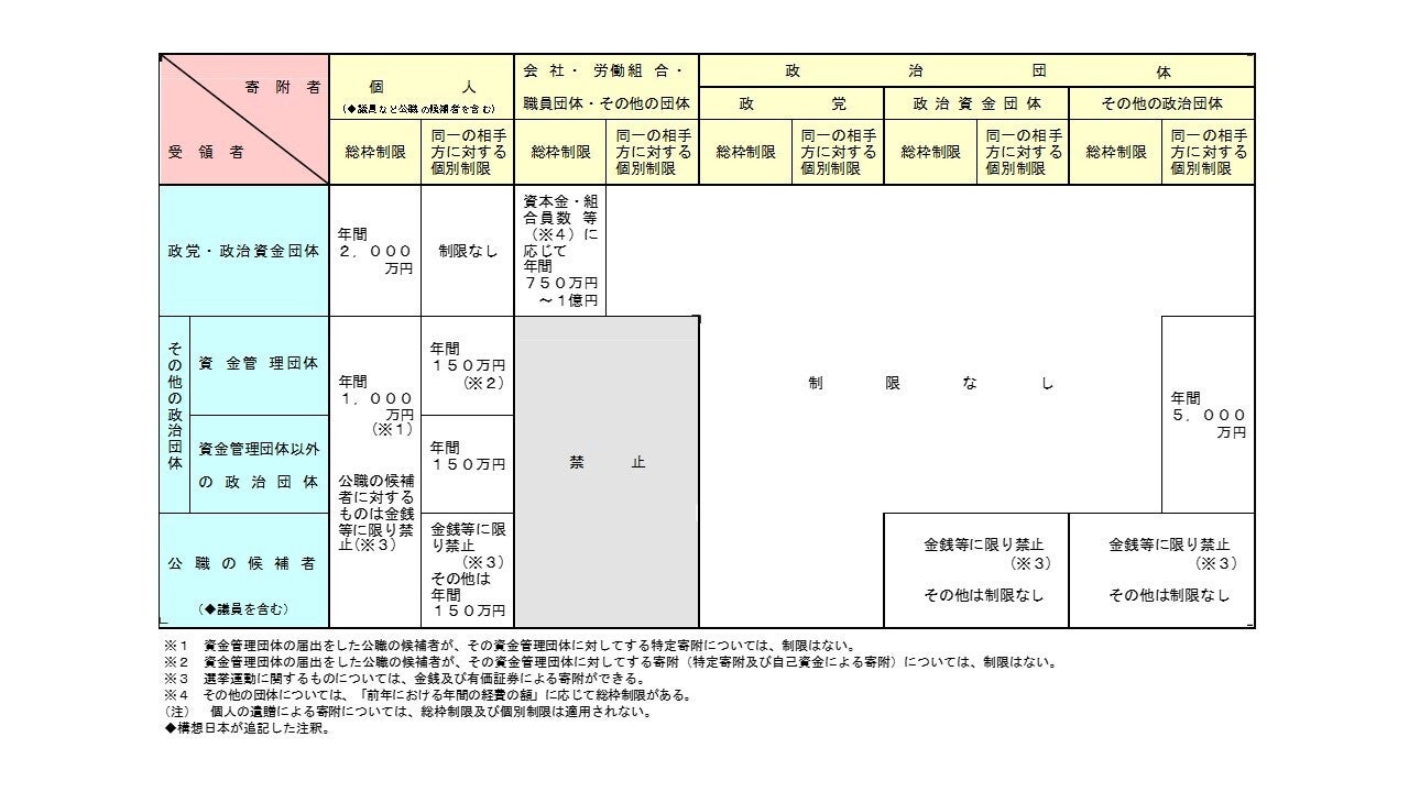 (1)政治とカネの問題を解決するには、企業献金など個々の資金ルートや金額を制限しても効果はありません。なぜなら資金を、議員個人・政治団体・政党(支部を含む)の間で自由に動かせるからです。