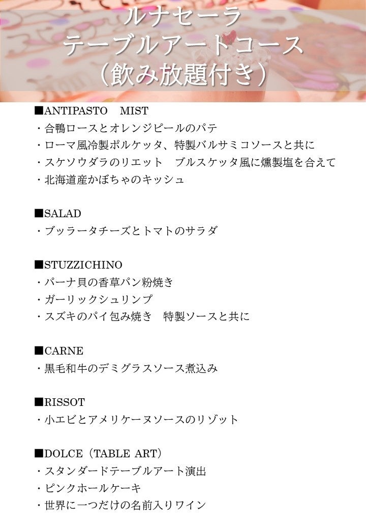 ③名前入りワイン付き!ルナセーラ・テーブルアートコース(飲み放題付き)20000円