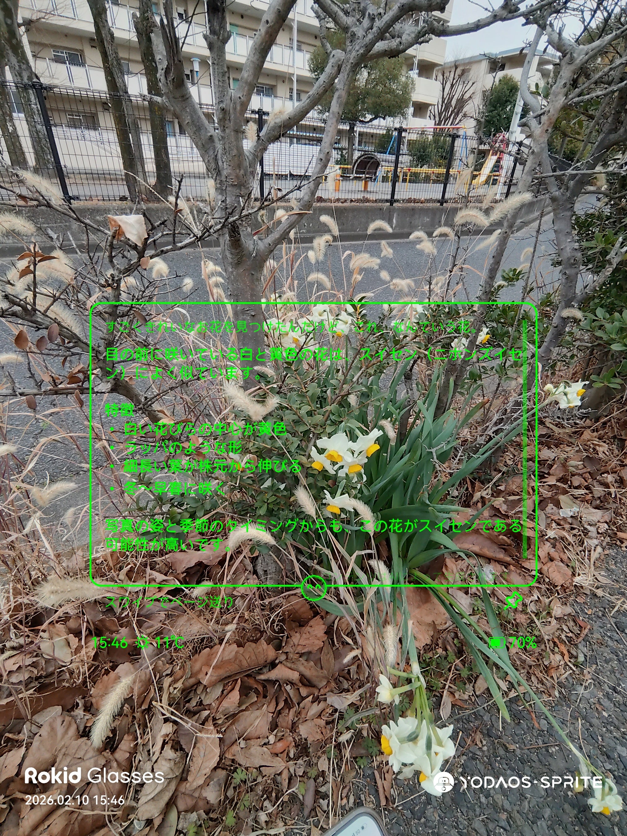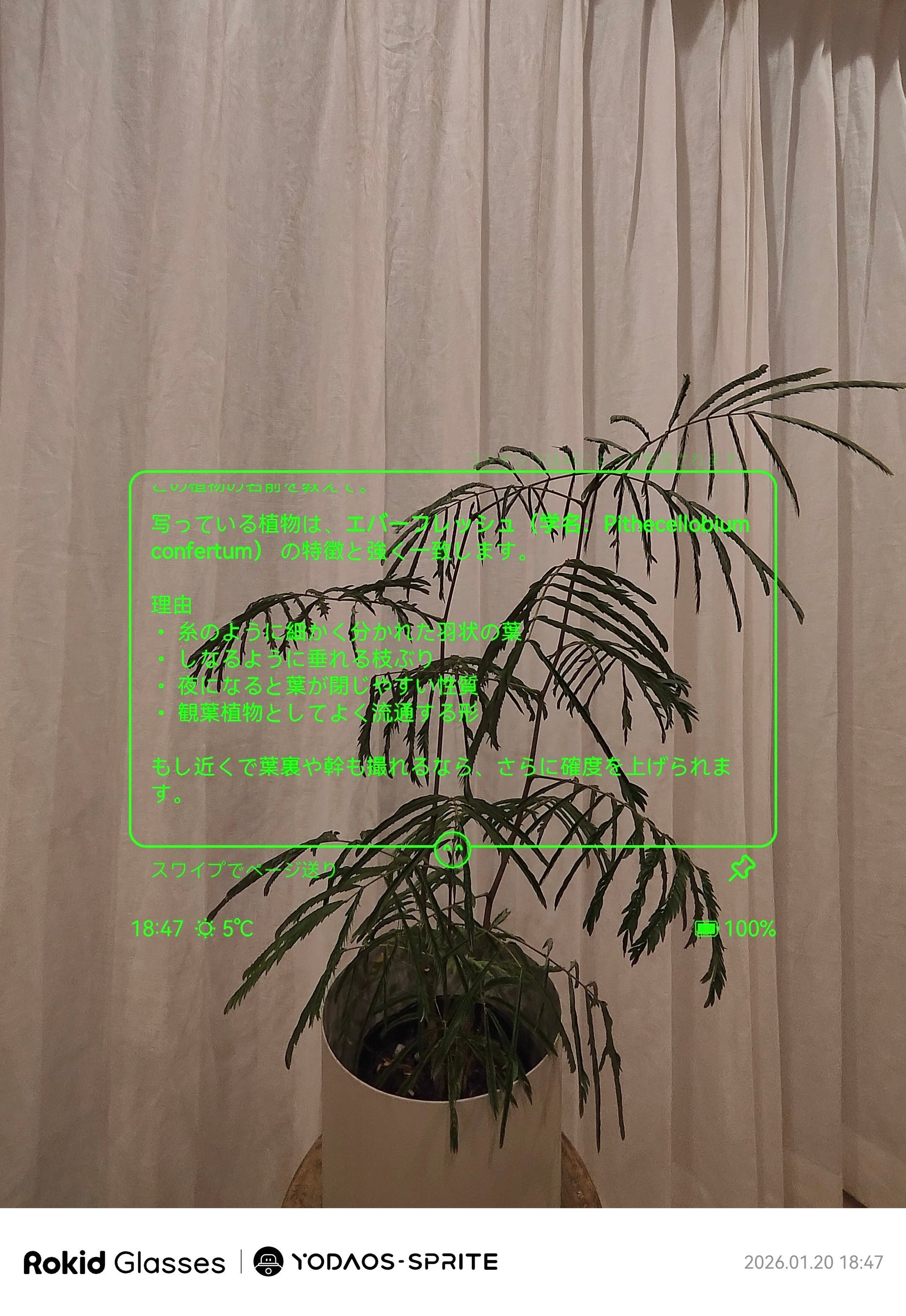 気になる対象を見て「Hi Rokid」と話しかけるだけで、AIが映像情報を解析し、その場で解説を表示します。検索のためにスマートフォンを取り出す必要がありません。