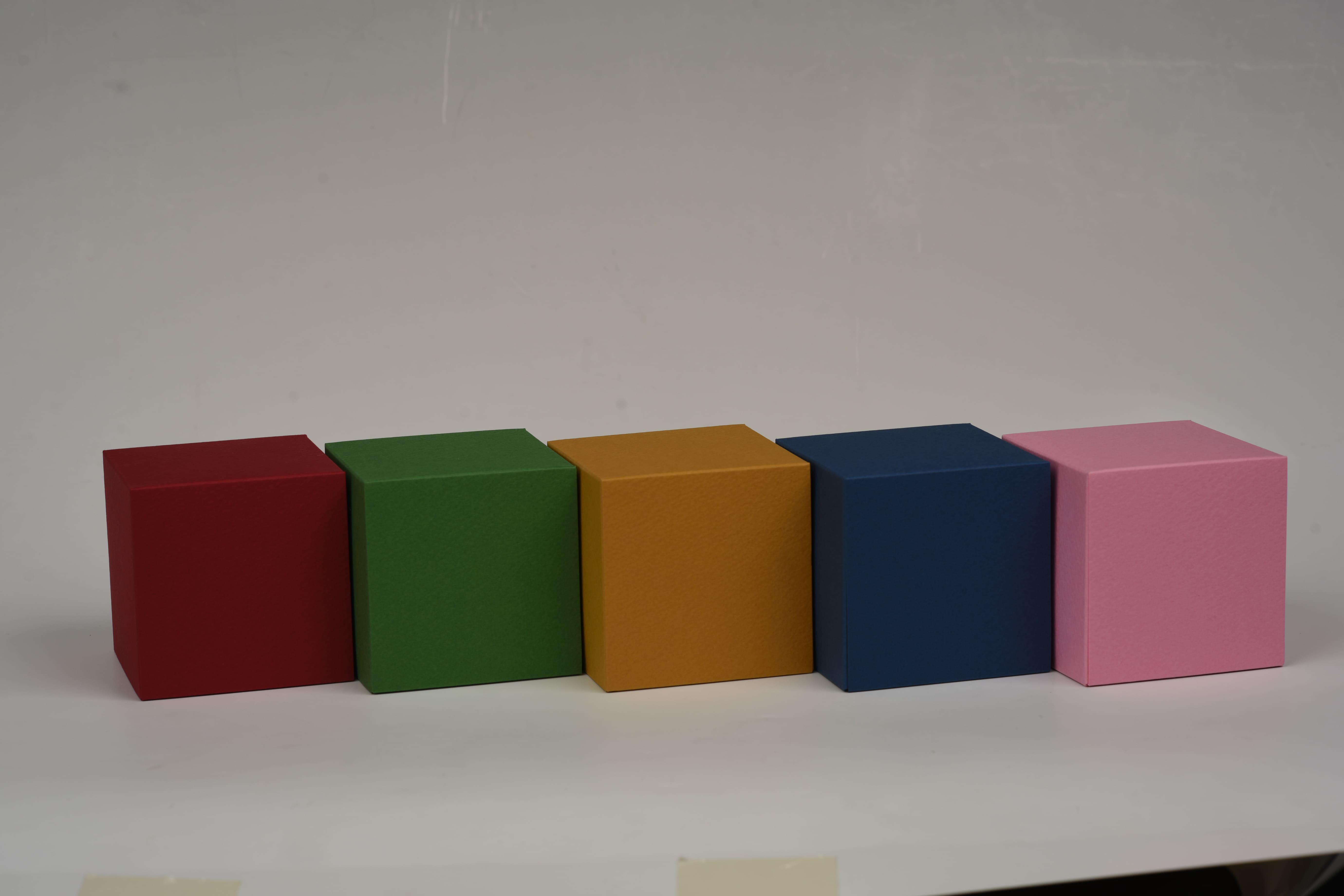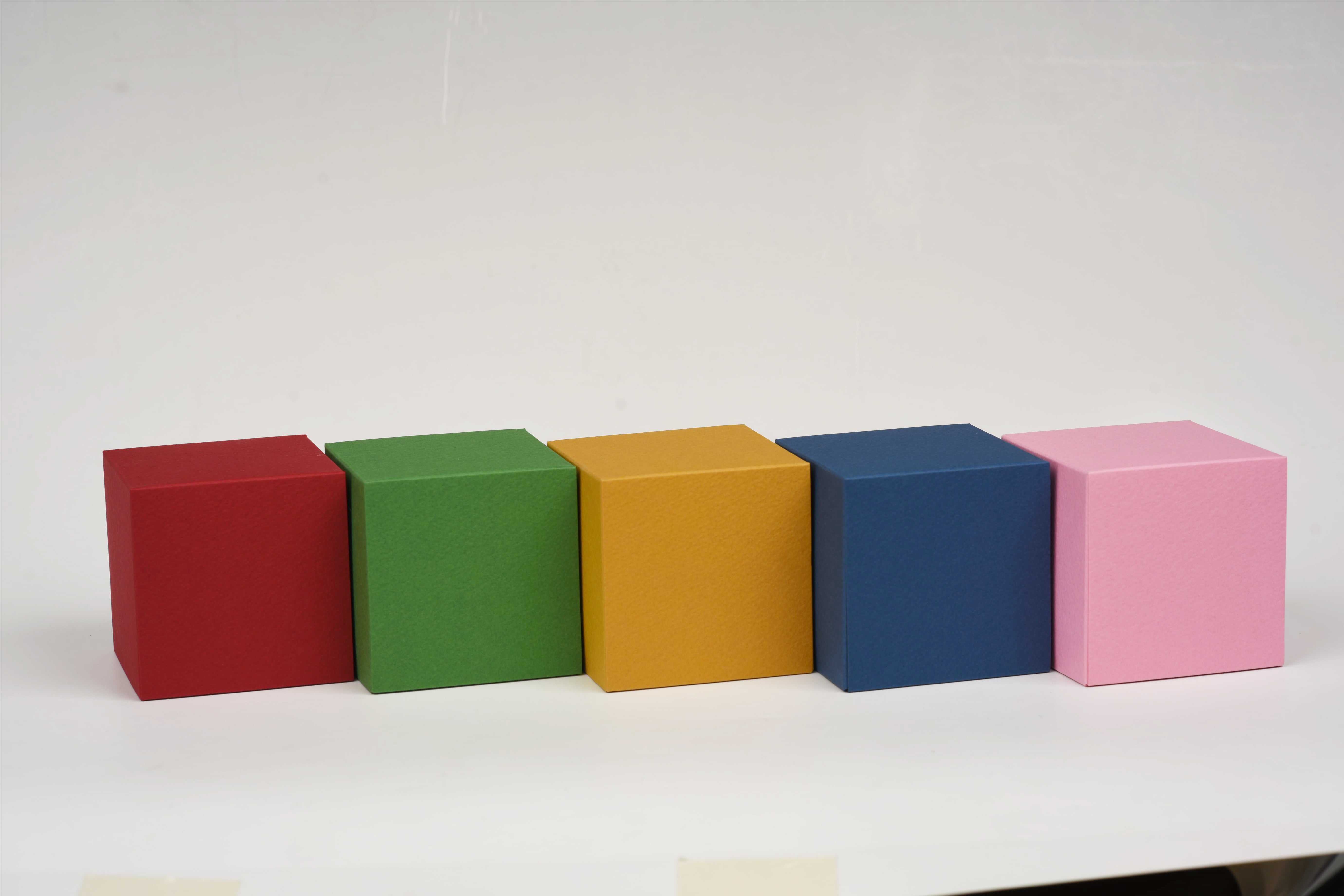 無地のキューブも落ち着いた色。青ではなく「藍」を、サフランは植物の染料をイメージした「黄土」を、赤は優しい「祝い紅」をラインナップしました。