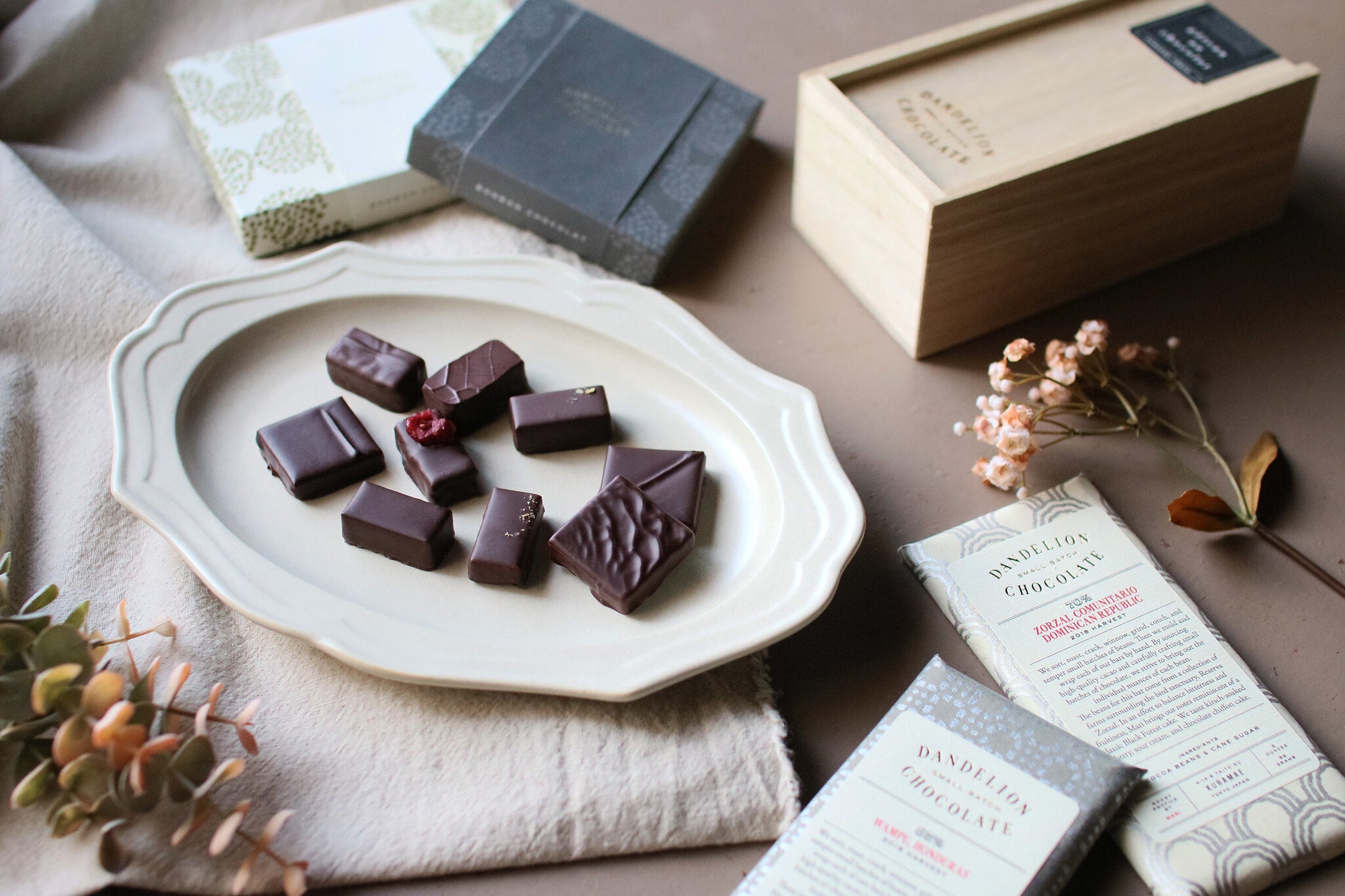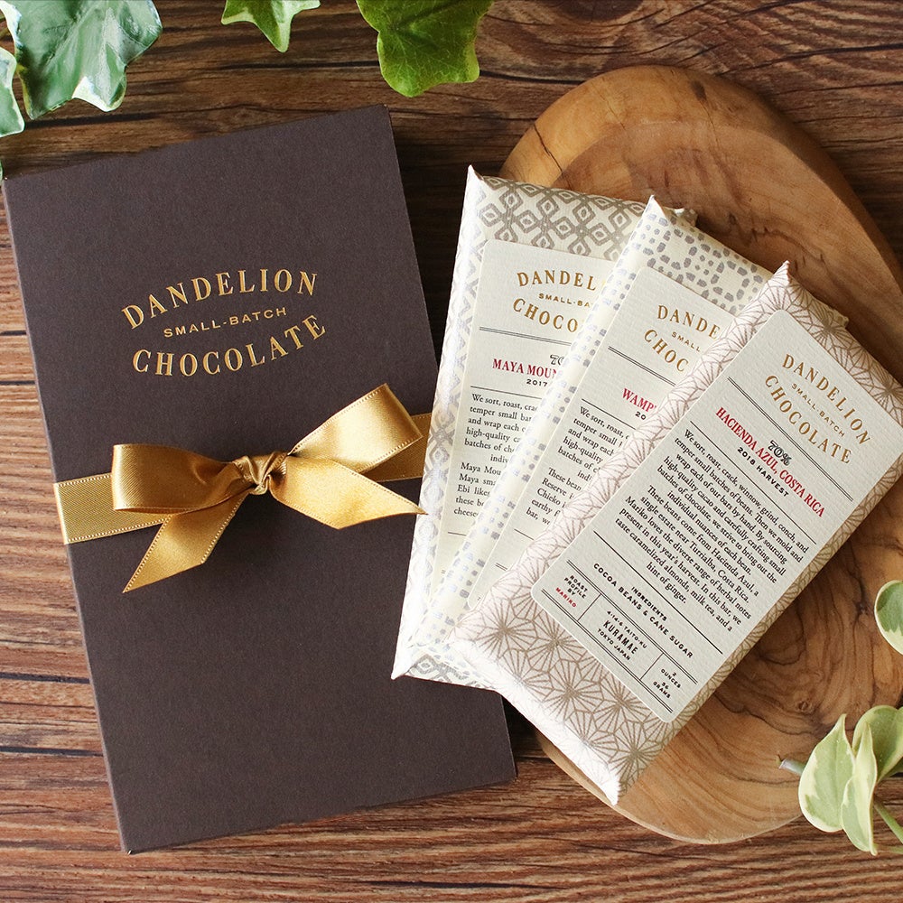 ダンデライオン・チョコレートのシグネチャーアイテムであるチョコレートバー。産地の異なるチョコレートバーが入った「チョコレート・コレクション」は、2枚入りと3枚入りからお選びいただけます。シングルオリジン・チョコレートの醍醐味である産地ごとのフレーバーの違いやおすすめのペアリングを記載したリーフレットを同封しているので、Bean to Bar チョコレートに馴染みのない方にもお楽しみいただけます。