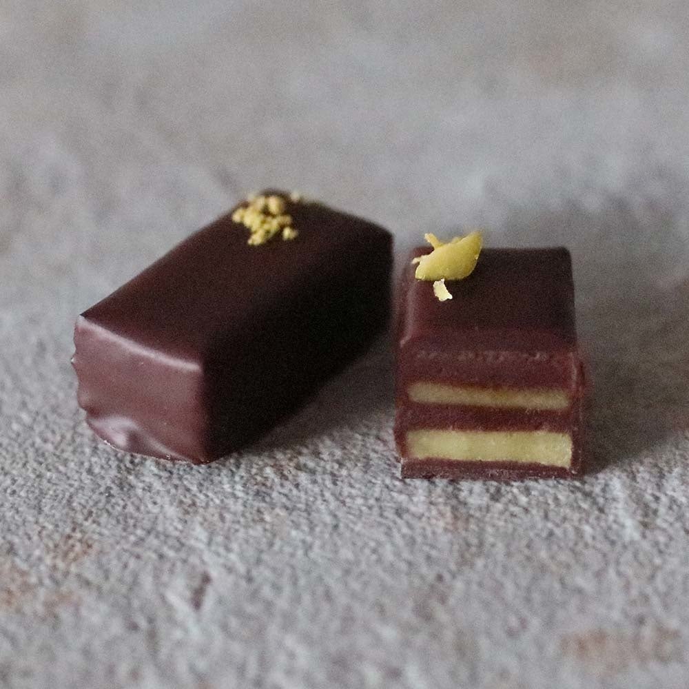 シエラレオネ産カカオのシングルオリジン・チョコレートガナッシュを、表参道店限定の人気ペストリー「オペラ ピスタチオ」のように層に仕立てて、チョコレートでコーティングしています。