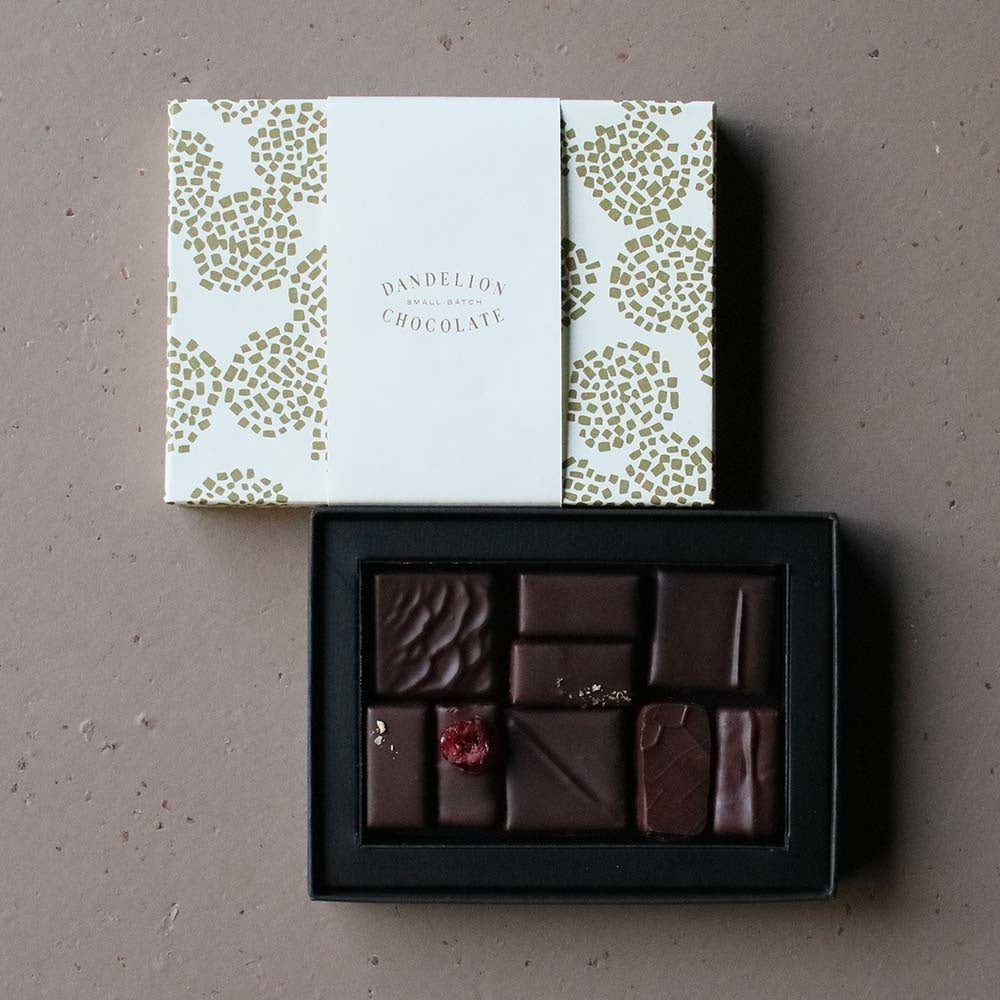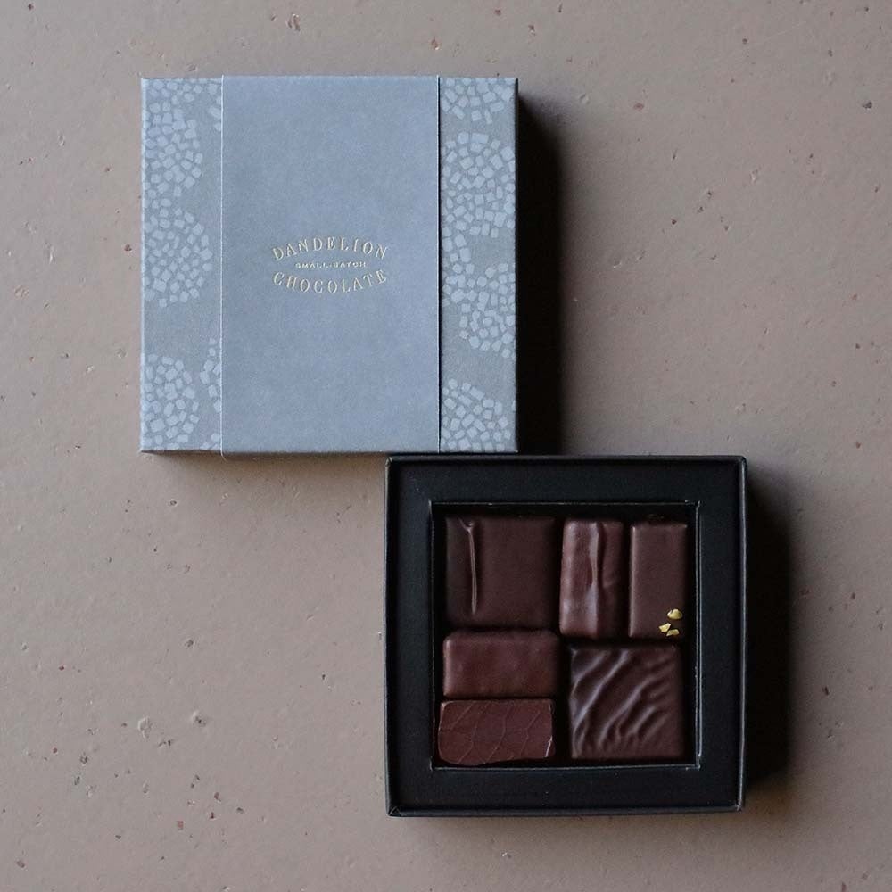 バッケージはダンデライオン・チョコレートのシグネチャーアイテムでもあるチョコレートバーの包装紙からデザインし、贈り物にふさわしい上品な仕上がりになっています。6個入りと9個入りと2種類のセットをご用意しましたので、用途に応じてお選びいただけます。