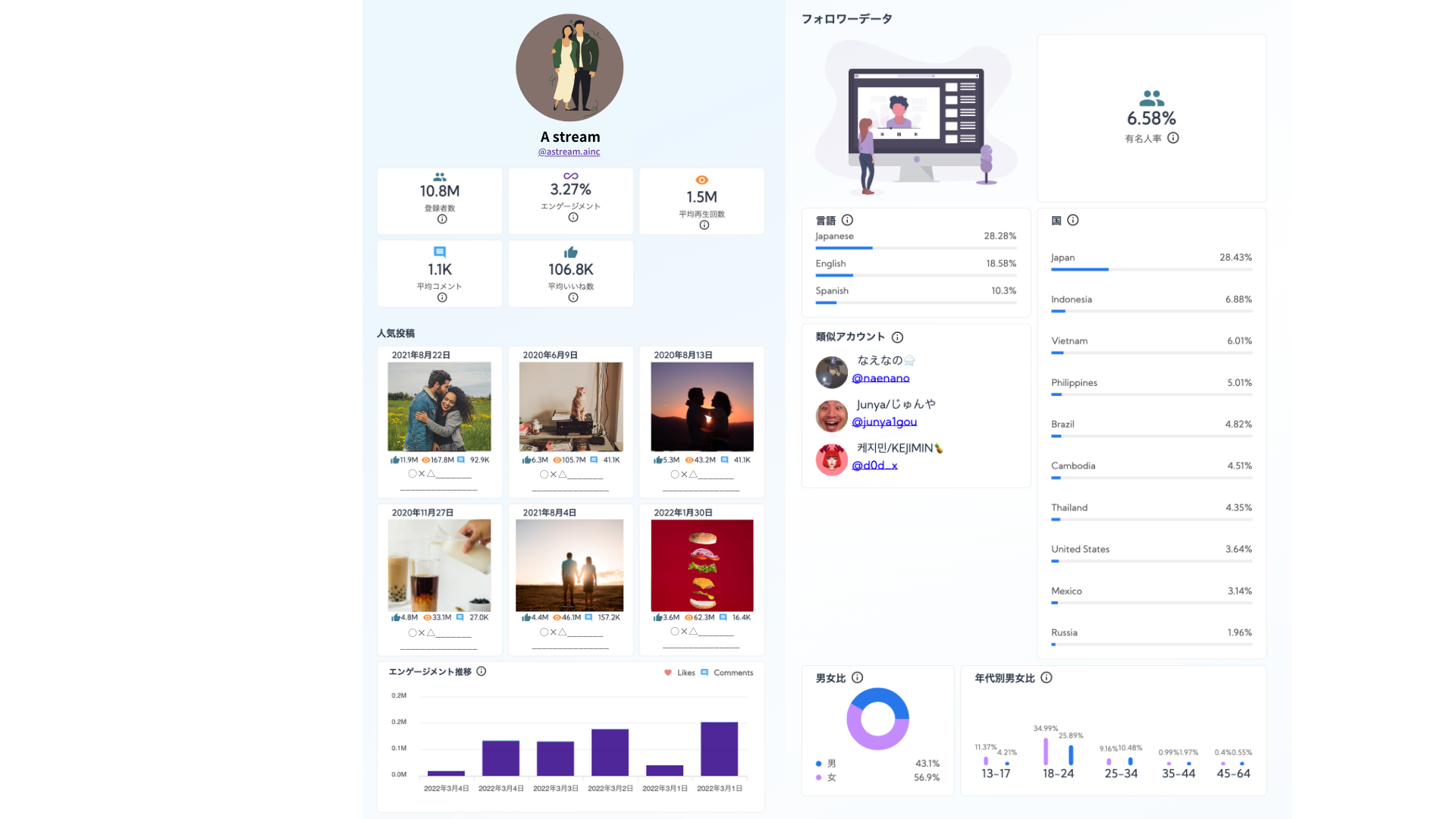 『A stream』はこれまで取得不可能であった、インフルエンサーのフォロワーの”興味関心”や”ブランドの好み”といったサイコグラフィック情報の分析を可能にする新時代のAIマーケティングツールです。
