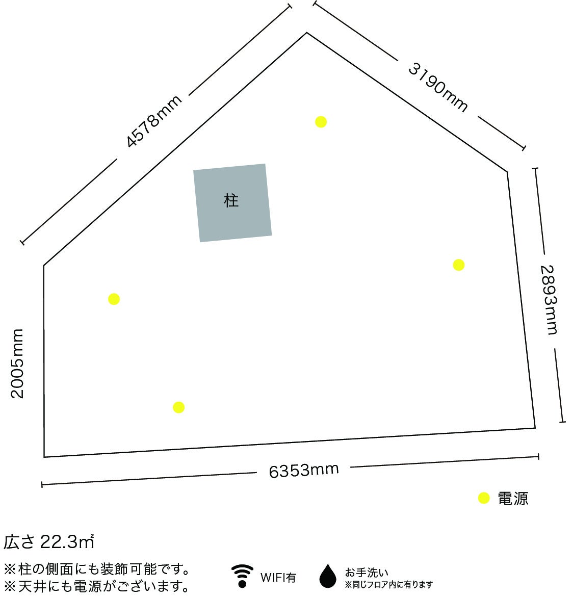 エスカレーターすぐ横の会場は、突き出すような三角状のスペースのため、自然と人が入るような導線になっています。クリエイティブフロアの玄関口で存在感を発揮し、人が絶え間なく行き交う通りならではの展開ができます。ポップアップ、展示場、レンタルギャラリー、ショールームなどさまざまな使いかたが可能です。
