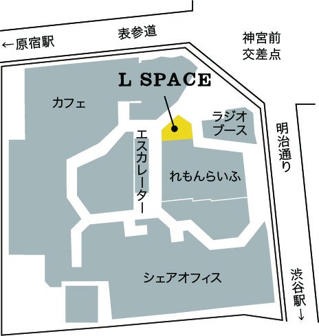 1日に何十万人もの人が行き交う神宮前の交差点。そこに誕生した商業施設「ハラカド」。その3階はクリエイティブフロアになっており、商業でありながらも、クリエイターが仕事をする「場」になっています。「L SPACE」は、エスカレーターを上がってすぐ、クリエイティブフロアの玄関口になる、もっとも目を引く場所。商品の販売やアートの展示など、様々な用途で使っていただけるスペースです。