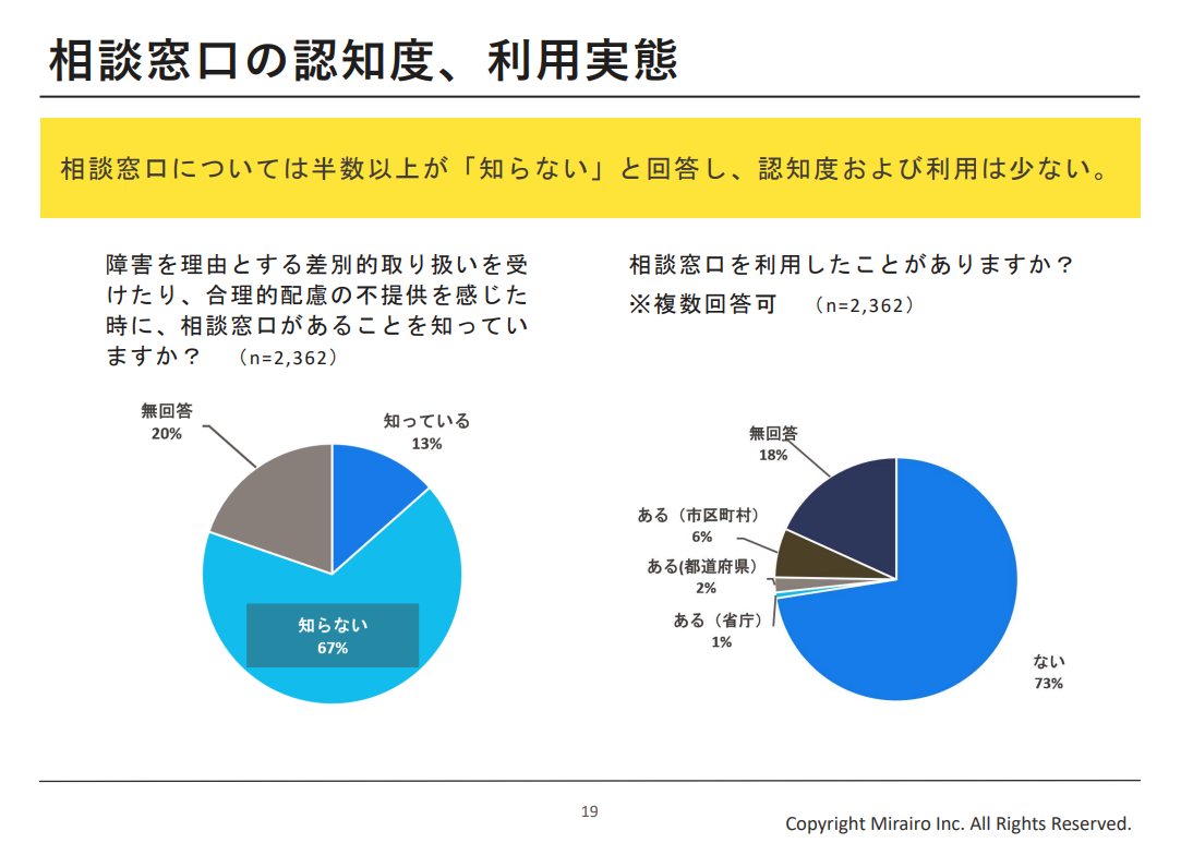 行政がもうけている相談窓口の認知度、利用実態についてもアンケートで聞いたところ、そもそも相談窓口があることを知らない人が約7割近くにのぼり、利用したことがある方も約10%と低い水準であることがわかりました。改正障害者差別解消法では内閣府が中心となって相談窓口を明確化することが基本方針として掲げられていますが、本アンケート調査でも障害のある当事者にとって身近に、わかりやすく相談窓口が整備されるニーズがあることが浮き彫りになりました。
