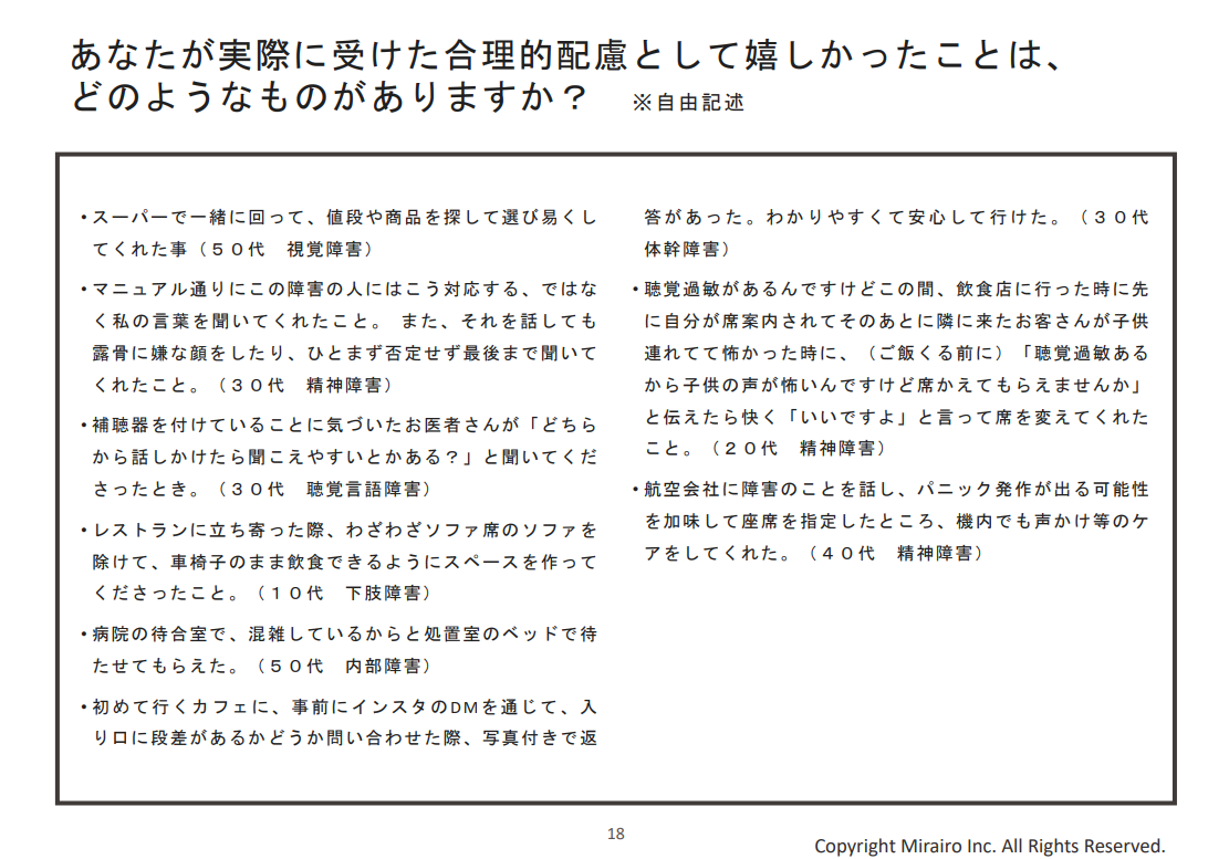 今回のアンケート調査では、障害のある当事者にとってうれしかった合理的配慮が実践された事例を収集しました。サービス分野のみならず、雇用、教育など様々なシーンで合理的配慮が実践されていることもわかりました。まだまだ合理的配慮という言葉の認知度を高めていく必要はありますが、各業界で実践されている合理的配慮のGOODプラクティスを今後も収集し、発信していきます。