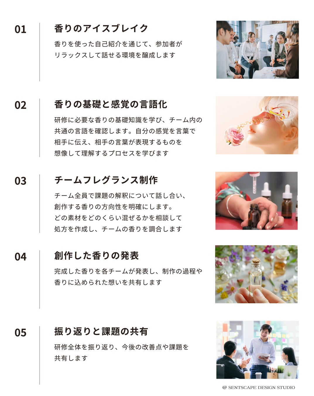 チームでひとつの香りを創り上げていく過程をとおして、チームメンバー同士のコミュニケーションと信頼関係を高め、創造性を引き出すことを目的としています。