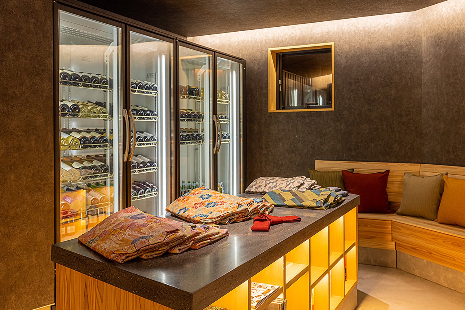 浴衣は旅のリゾートウェア!お客様をお迎えするロビーにはお好みで選べる色浴衣をご用意。ご希望の方はこちらで選んでお部屋へお持ちください。セラーにはシャンパンをはじめワインや日本酒、当地おすすめの地ビールなども取り揃えております(有料)。