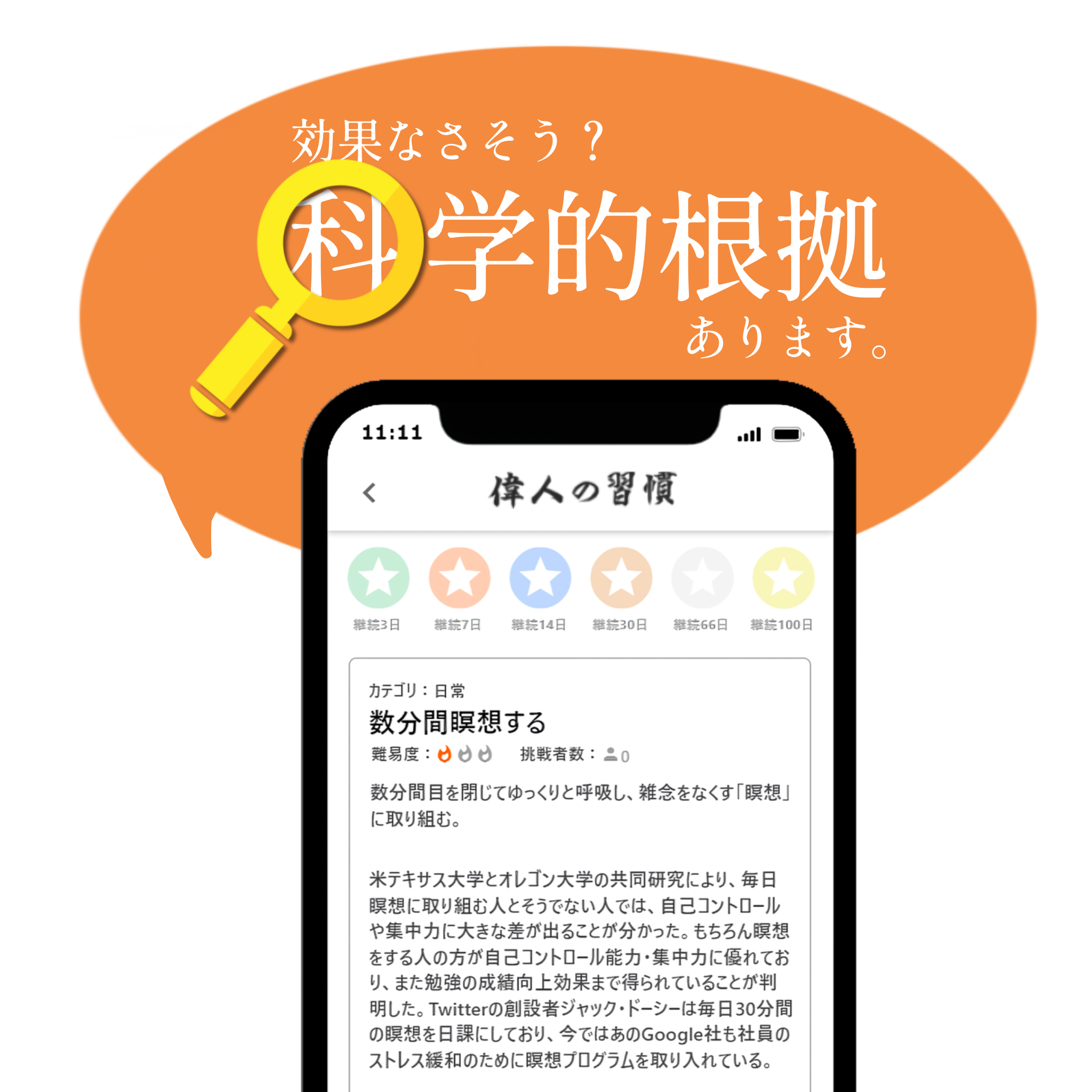 さらに実際に偉人が取り入れていた方法や効果を知ることも出来るため、着実に自分のモノに出来てしまうのもこのアプリの魅力です。