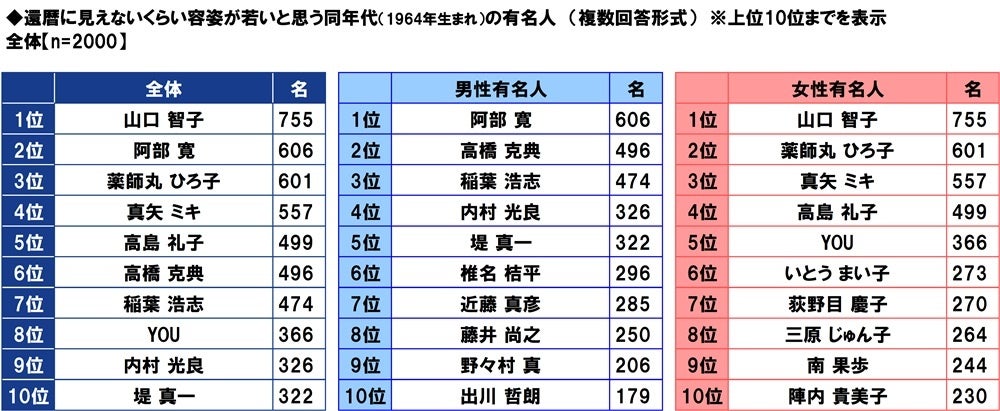 還暦に見えないくらい容姿が若いと思う1964年生まれの有名人を聞いたところ、男性有名人では1位は「阿部 寛さん」、女性有名人では1位は「山口 智子さん」でした。俳優として長きにわたり活躍しているお二人が今年の還暦人の憧れになっていることがわかりました。