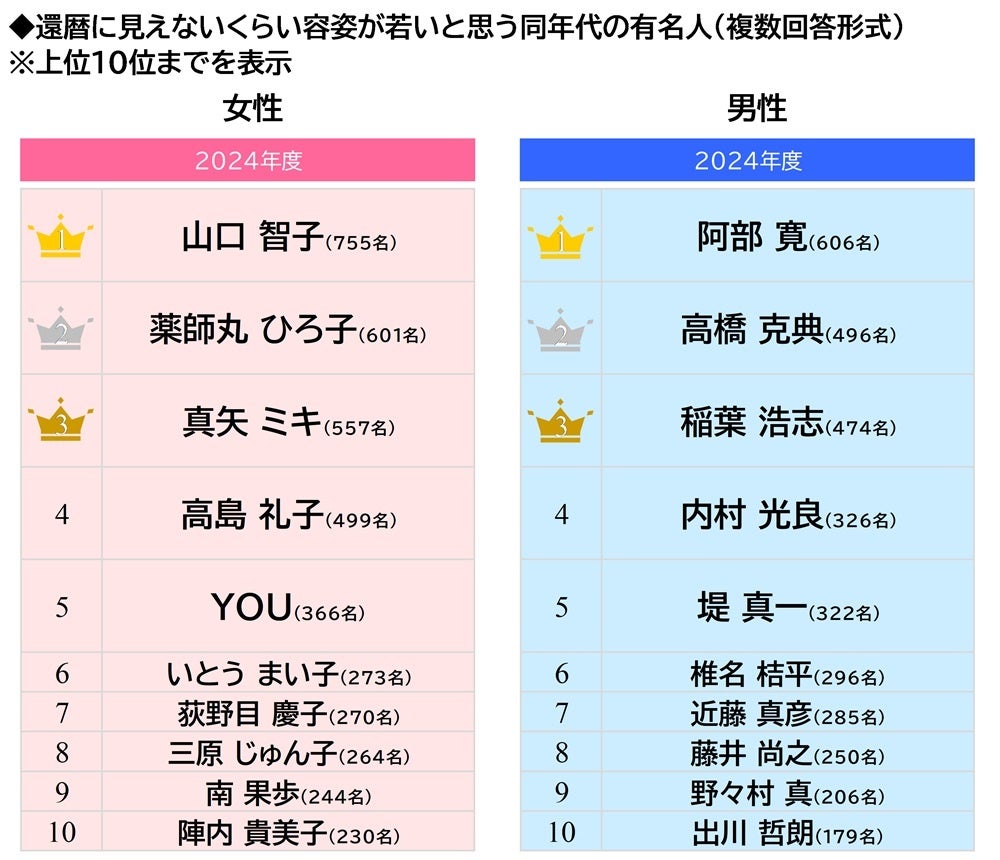 還暦に見えないくらい容姿が若いと思う同年代の有名人を聞いたところ、俳優として活躍している「山口 智子さん」が1位となりました。昨年の調査(※)では「唐沢 寿明さん」が1位となっており、2023年度・2024年度あわせて夫婦で二冠という結果でした。以降、2位「阿部 寛さん」、3位「薬師丸 ひろ子さん」が続きました。