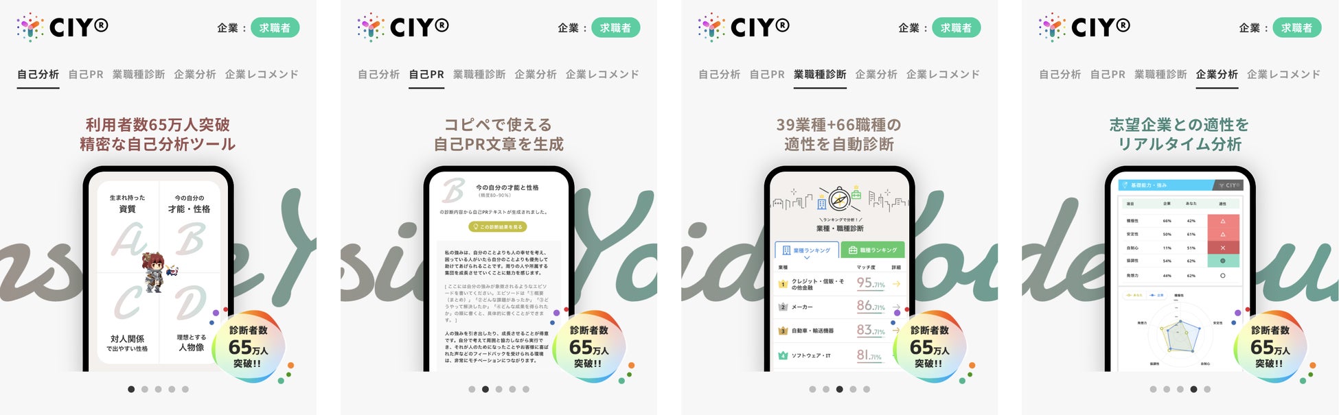 CIY®は、就活生や転職希望者向けに、自己分析や適性の高い業種・職種のアドバイスを行なう採用ツールです。