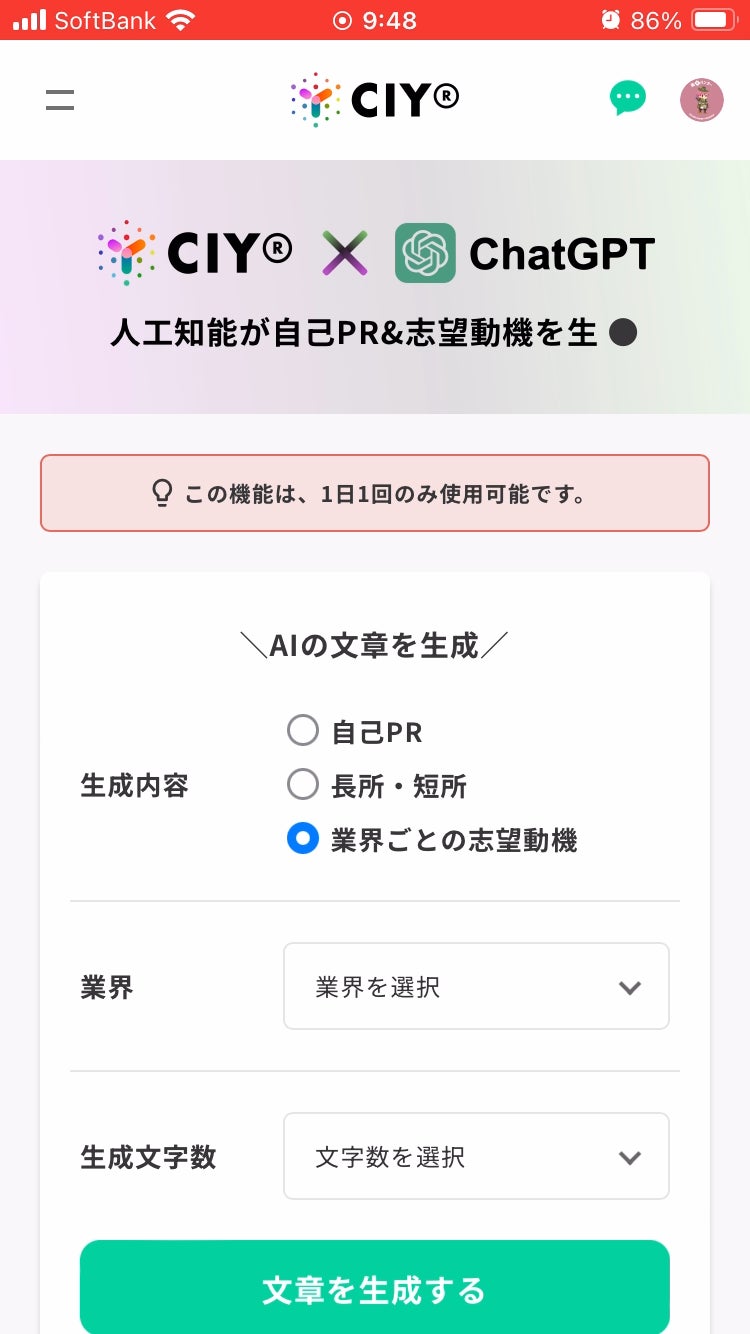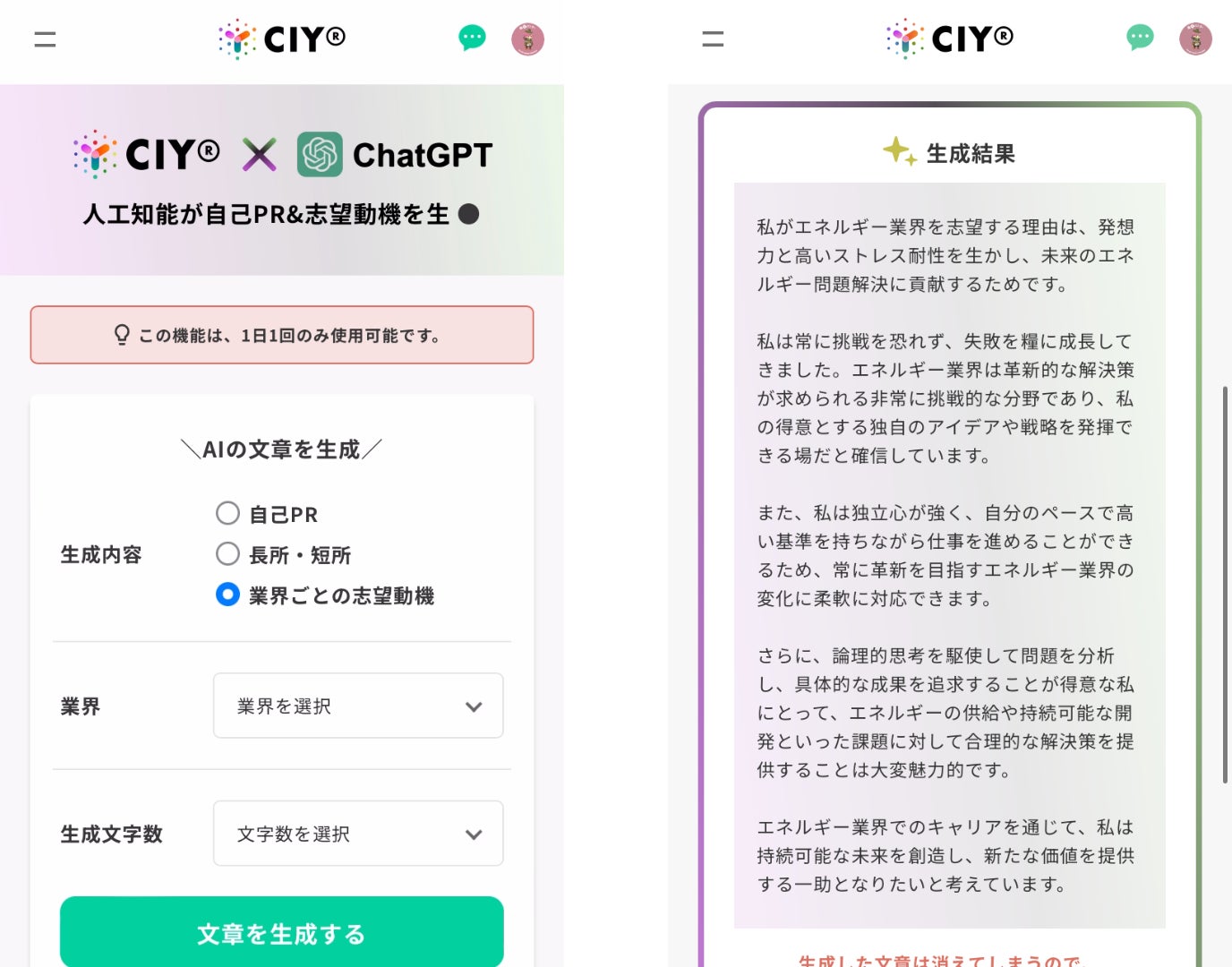 CIY®(シーアイワイ)の自己分析結果から、個人の特性や強み弱みを踏まえた業界別の志望動機を、ChatGPTが自動的に生成するサービスを提供開始。