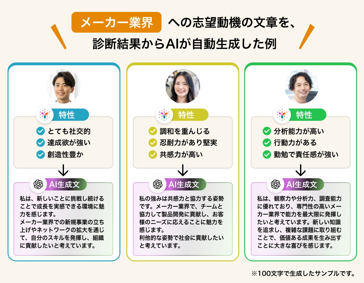 最大の特徴は、ユーザーごとに本人の自己分析結果をベースとした志望動機などを生成できる点です。