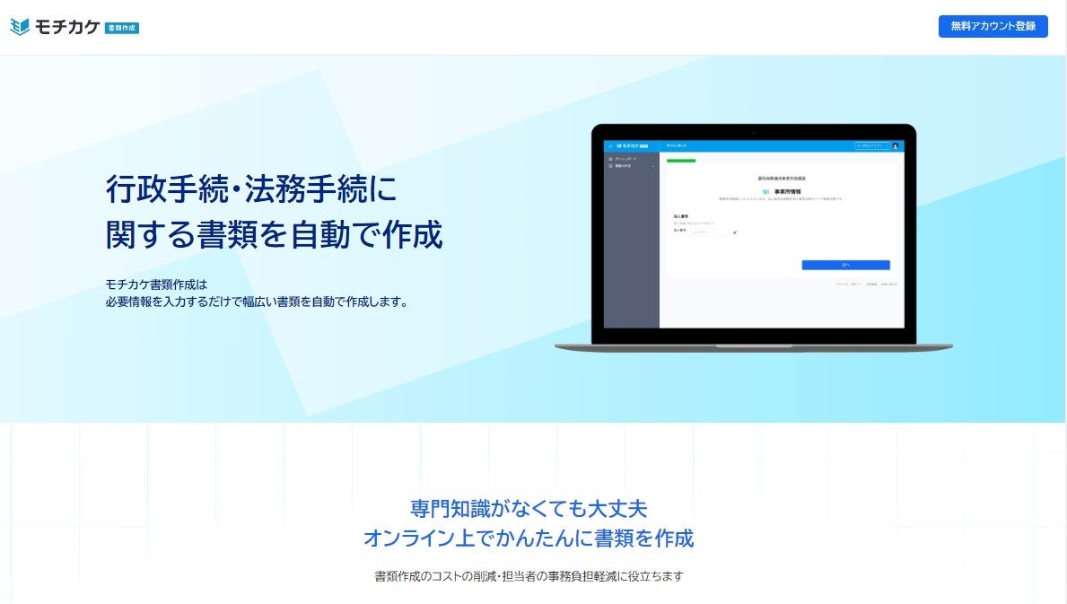 また、法務分野の書類作成については、現在も会社の登記手続を自動作成するLegalScript(https://legal-script.com)を提供しておりますが、今回新たに登記手続に限らず、あらゆる種類の行政手続及び法務手続に関する書類を自動作成する『モチカケ書類作成』(https://admin.legal-script.com/lp/create/)の提供を開始いたしました。