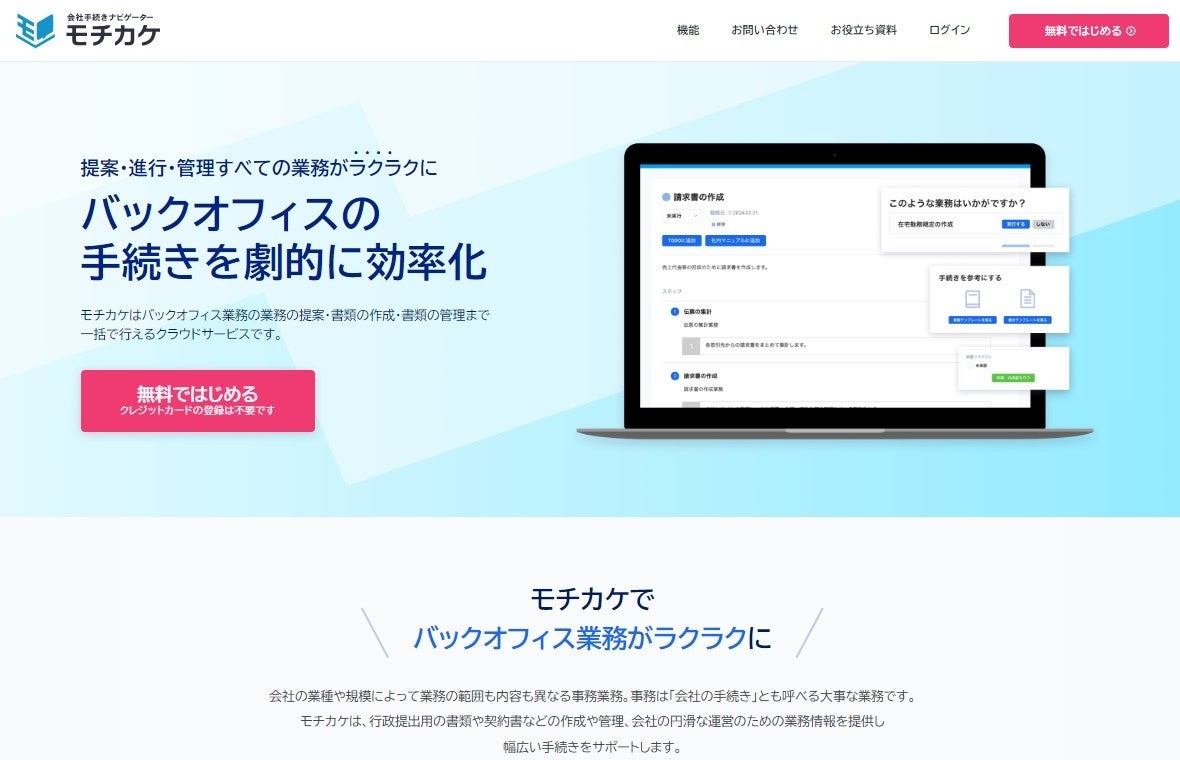 当社では、中小企業のあらゆるバックオフィス業務を支援する統合型サービスLegalScript会社管理を展開してまいりました。この度、『LegalScript会社管理』は会社手続きナビゲーター『モチカケ』として、リニューアルリリースされたことをお知らせいたします。