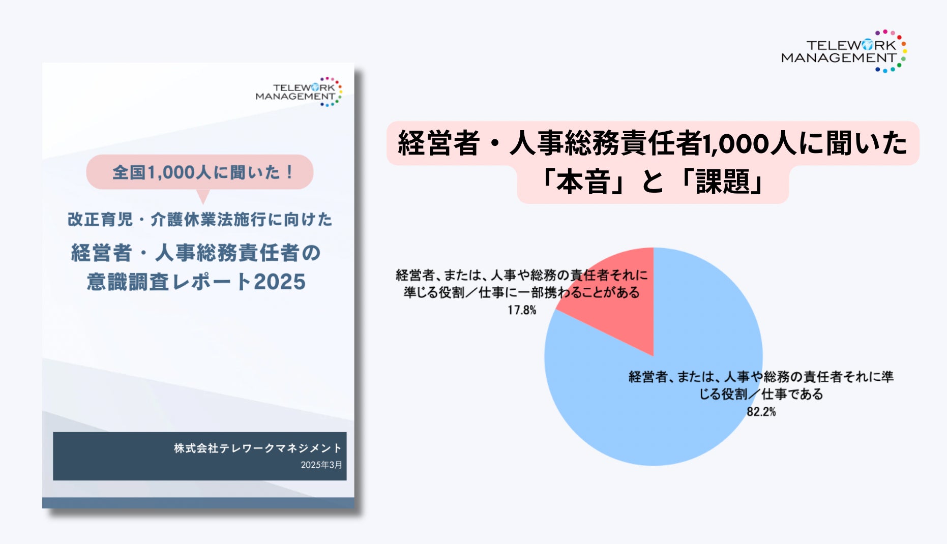 こうした法律の大きな転換に対して、日本初のテレワーク専門コンサルティング会社である株式会社テレワークマネジメント(本社:北海道北見市/代表:田澤由利)は、企業の現場でどのように受け止められているかを把握すべく、全国の経営者および人事・総務責任者1,000名を対象に緊急調査を実施。その結果をレポートとして公開します
