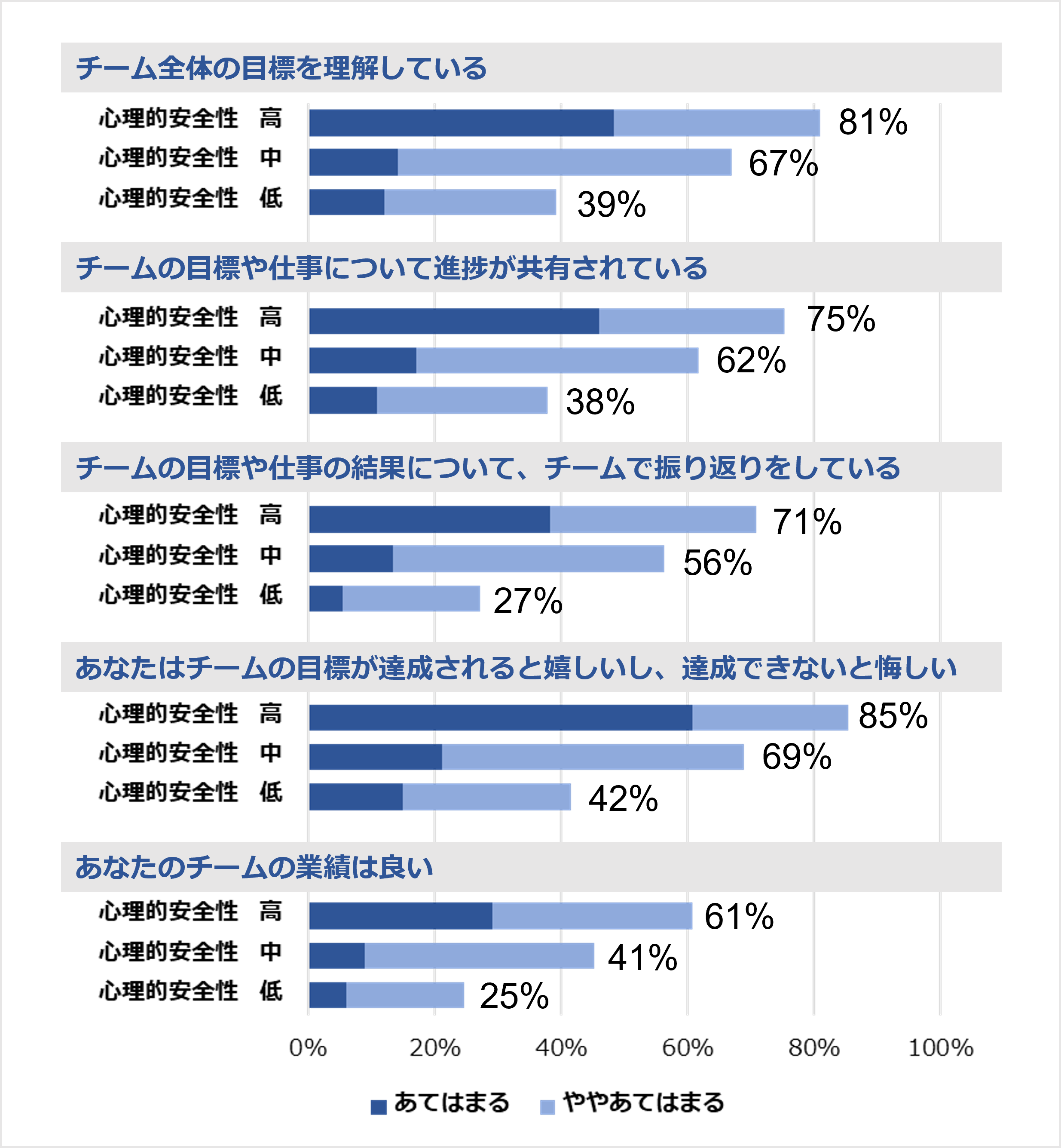 チームの業績は関係性以外にも様々な要因が影響しますが、「あなたのチームの業績は良い」の質問についても、心理的安全性の高いチームほど「あてはまる+ややあてまる」と回答した割合が多くなりました。