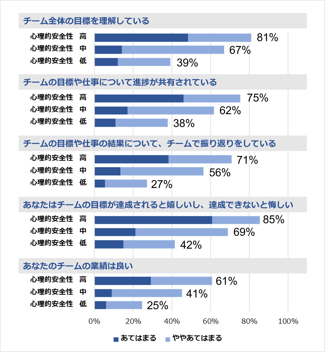 ただし、今回の調査からは因果関係までは読み解けるわけではありません。一般的には心理的安全性が高い土壌があることで、目標達成への取り組みが行われ、業績に結び付くと言われています。