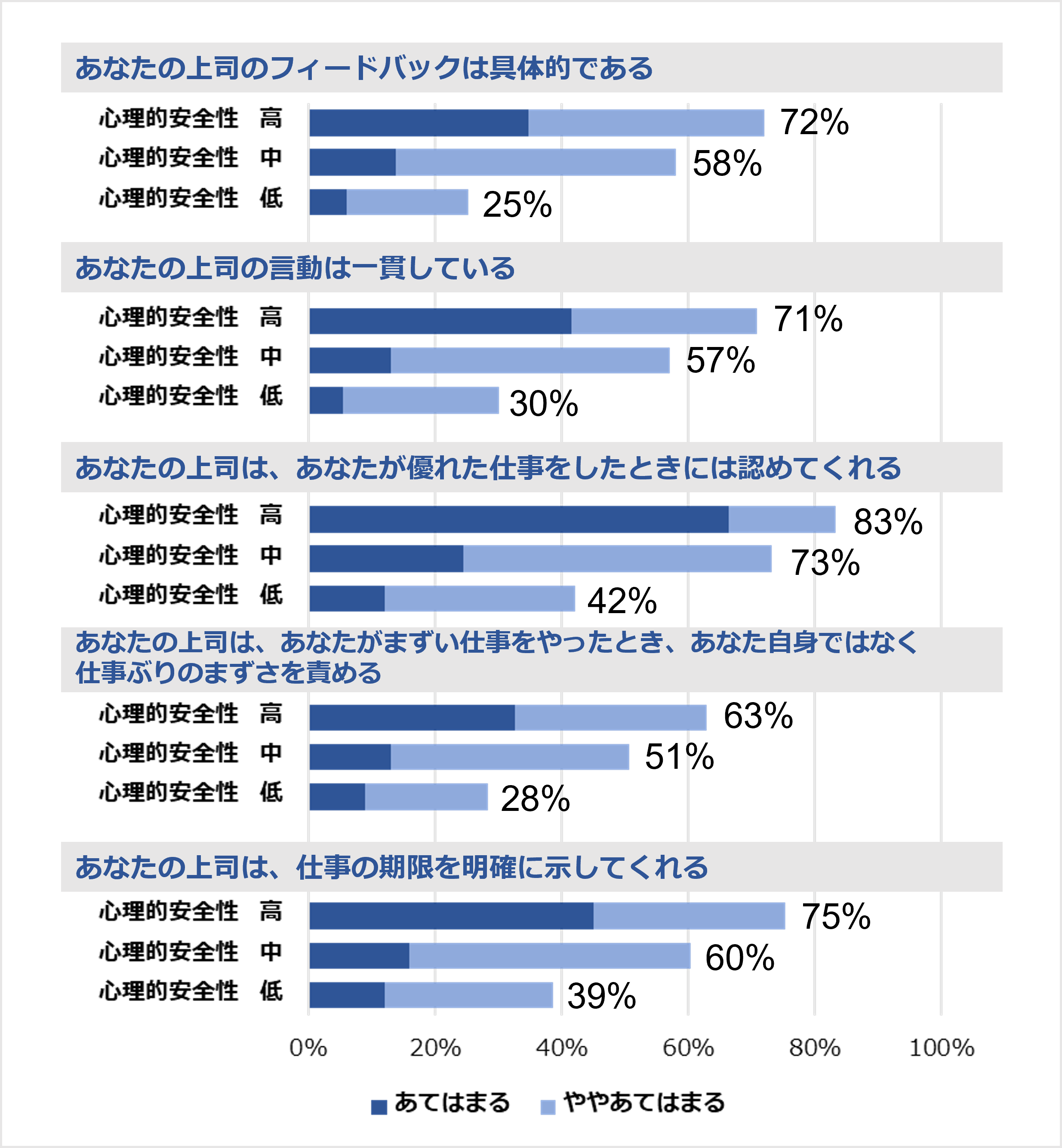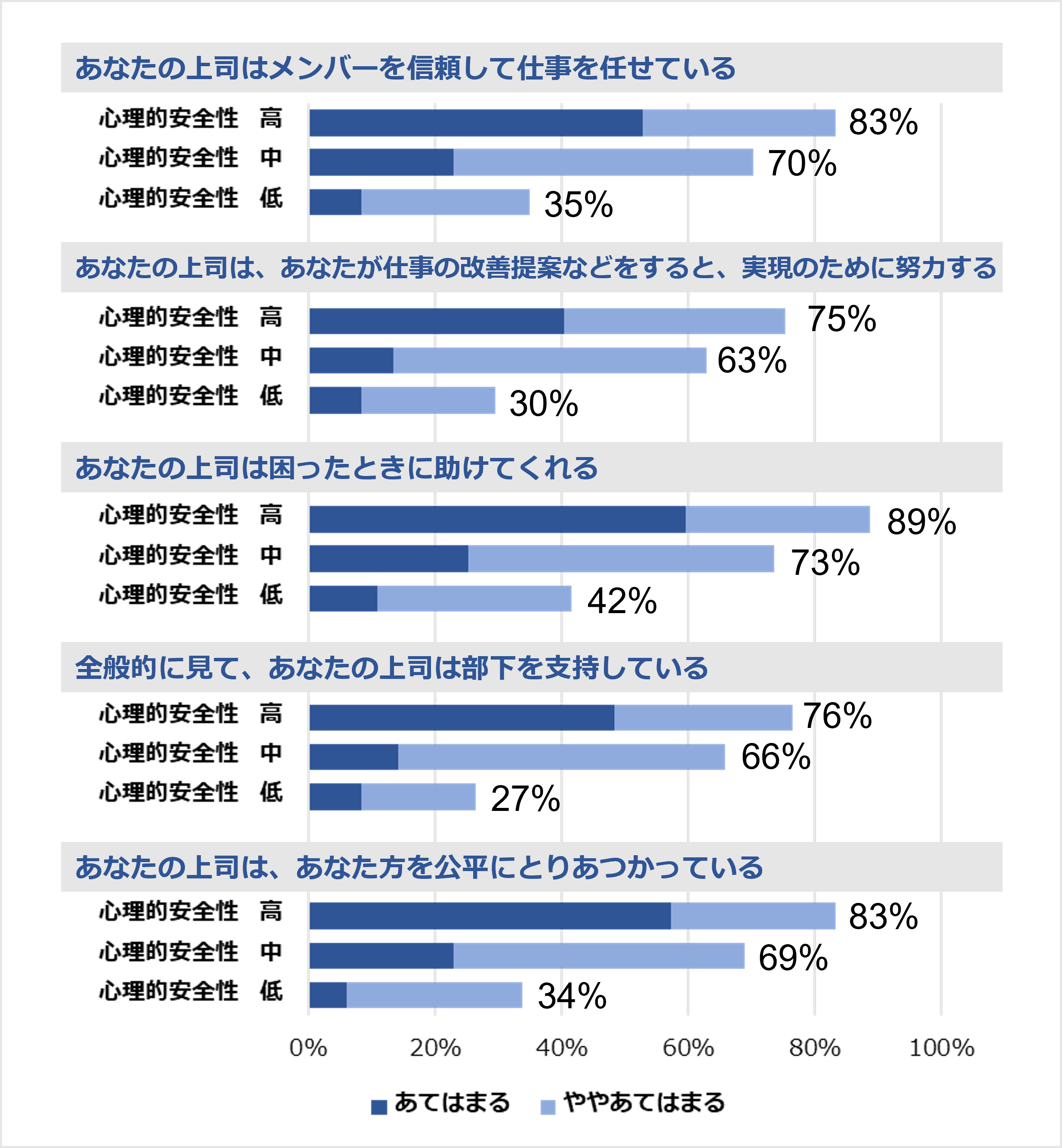 心理的安全性が高いチームの上司ほど、部下を信頼、支援、指示し、公平に扱うことが分かりました。このような上司の行動によって、自分の考えや気持ちを誰に対してでも発言できる安心感が高まります。