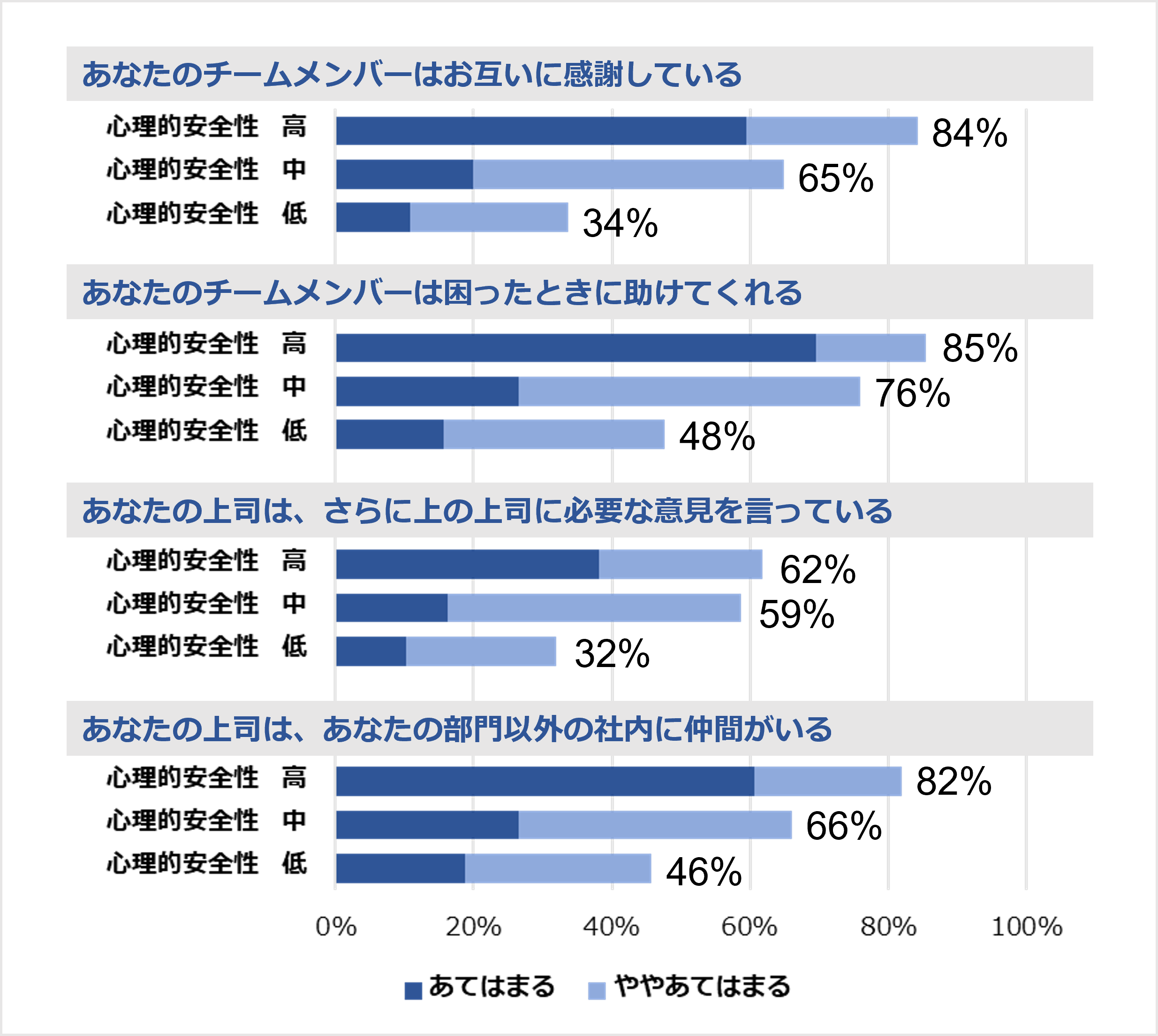 「あなたのチームメンバーはお互いに感謝している」について、「あてはまる+ややあてまる」と回答した割合の合計が「心理的安全性 高」群で84%、「心理的安全性 低」群で34%と、大きな差となりました。同様に「あなたのチームメンバーは困ったときに助けてくれる」についても、大きな差となっています。このように心理的安全性が高いチームほど、チーム内での感謝、そして助け合いが行われていることが分かりました。