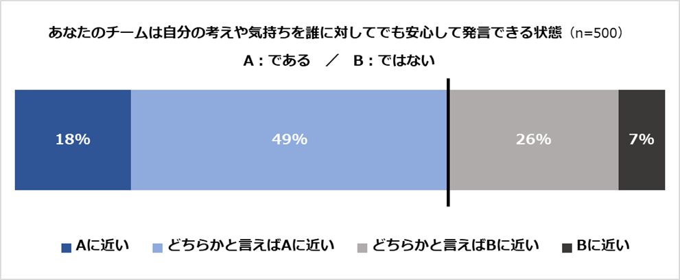 そこで「あなたのチームは自分の考えや気持ちを誰に対してでも発言できる状態である/でない」のどちらに近いかを質問した結果、「Aに近い」18%、「どちらかと言えばAに近い」49%と回答しました。