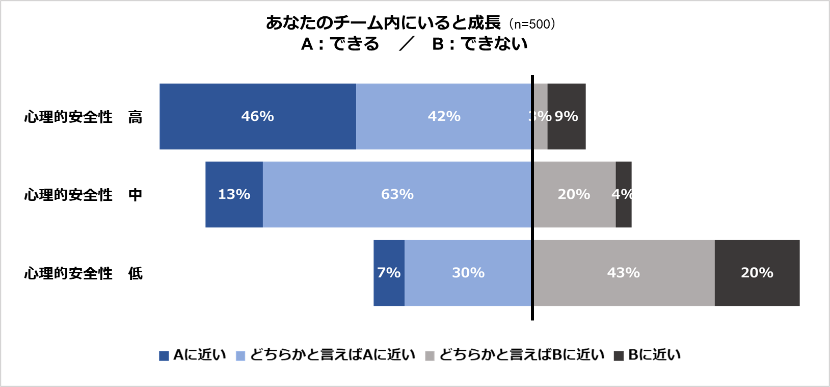 「あなたのチームにいると成長できる/できない」の質問について、「成長できる」に対して「近い」「どちらかと言えば近い」と答えた割合の合計は、「心理的安全性 高」群で88%でした。一方、「心理的安全性 低」群では、37%でした。つまり、心理的安全性の高いチームほど、若手社員は成長できると感じていることが分かりました。