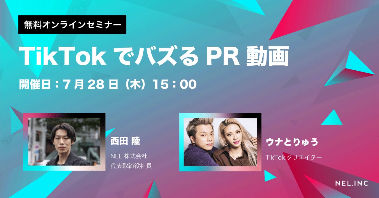 TikTokを中心としたSNSを活用し、企業のマーケティングを支援するNEL株式会社(本社:東京都渋谷区、代表取締役社長:西田 陸、以下NEL)は、TikTokフォロワー数130万人のセロウンブログの「りゅう」さんをゲストに迎え、7月28日(木)15:00より無料オンラインセミナー「TikTokでバズるPR動画」を開催いたします。