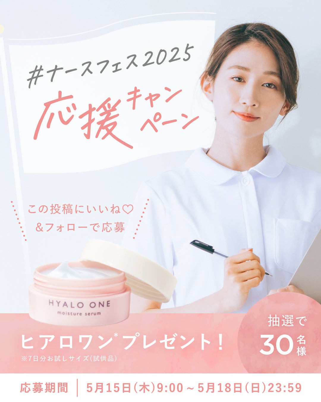 「ナースフェス2025」の開催を記念し、仕事柄ナチュラルメイクで過ごすことが多く、美容意識の高い看護師の皆さまに向けて、キユーピーウエルネスの時短オールインワン美容ジェル「ヒアロワン」の7日間お試しサイズ(試供品)を抽選でプレゼントいたします。