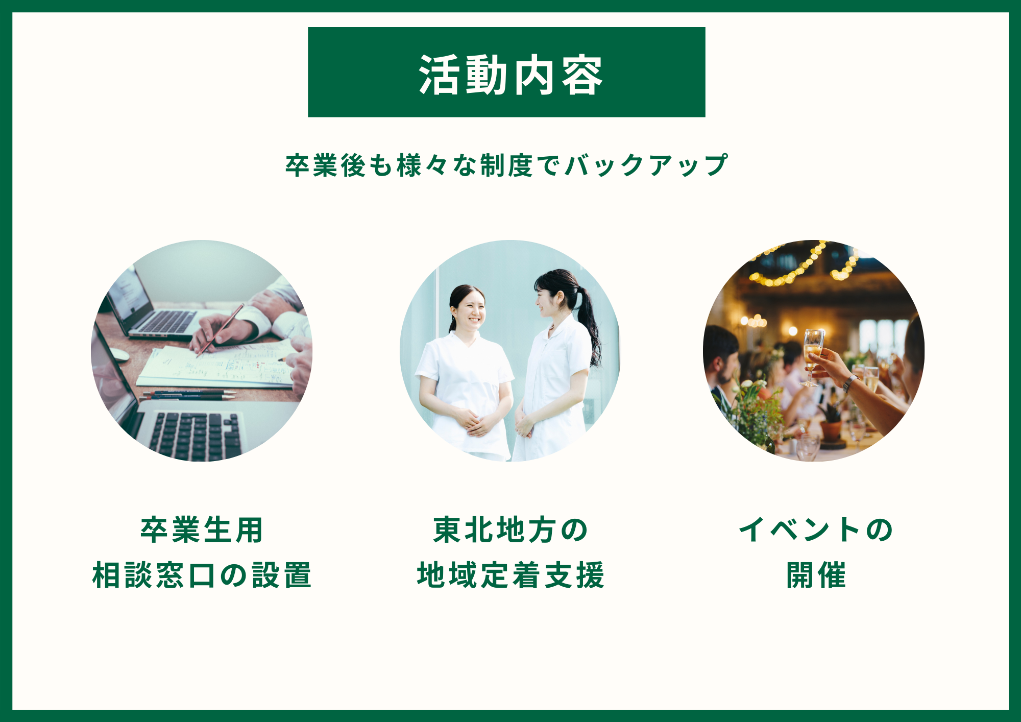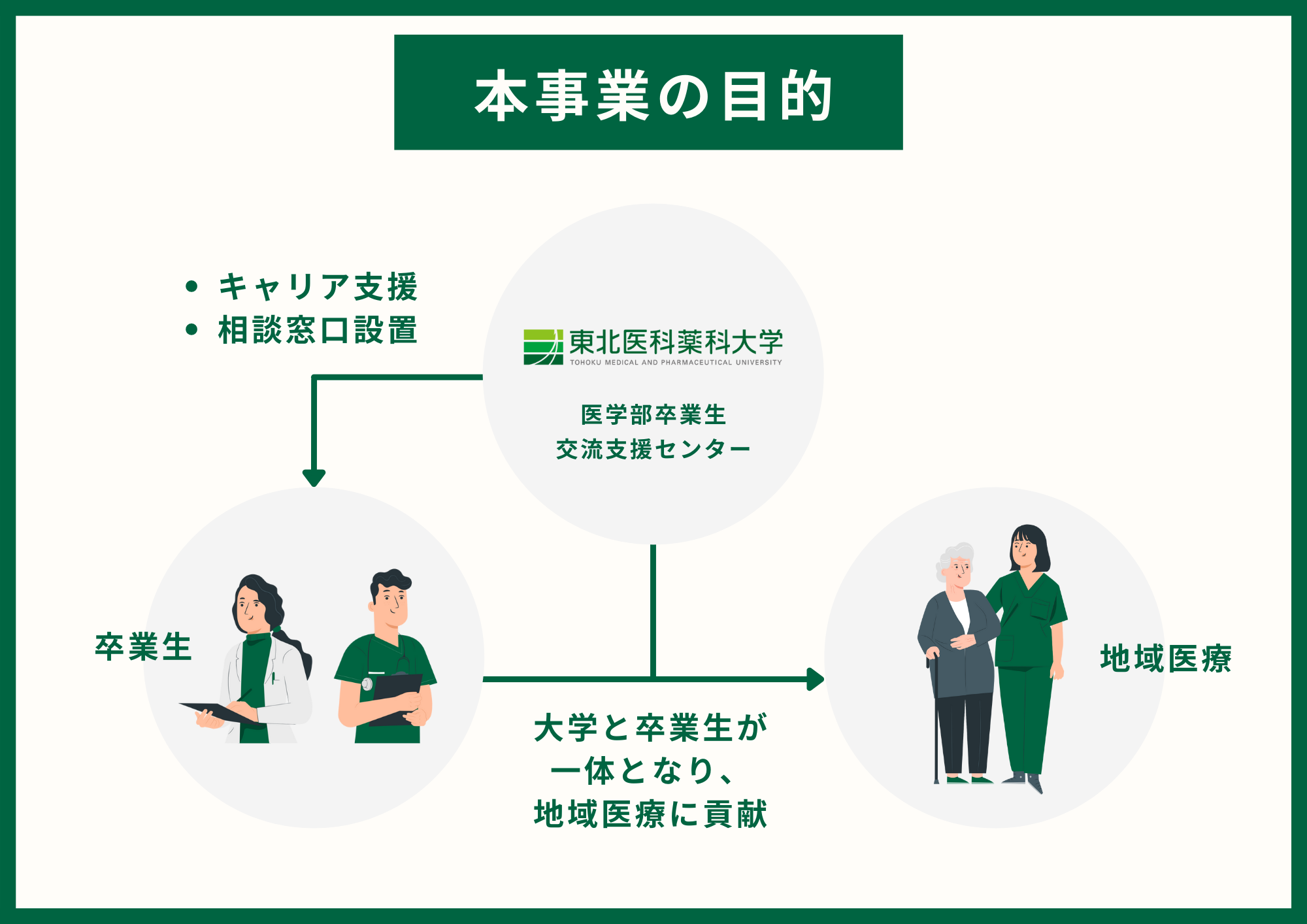 東北医科薬科大学では、3.11の震災後に東北の地域医療を支えていくことを目的として、2016年、日本で37年ぶりに医学部が新設されました。地域医療の課題の1つに「医師不足」があり、大学が卒業生 = 医師を支えることが、本質的に地域医療を支えることと考えており、今年2022年に医学部から初の卒業生が輩出される為、この機に体制を作っていきたいと考え、医学部卒業生交流支援センターの立ち上げに至りました。