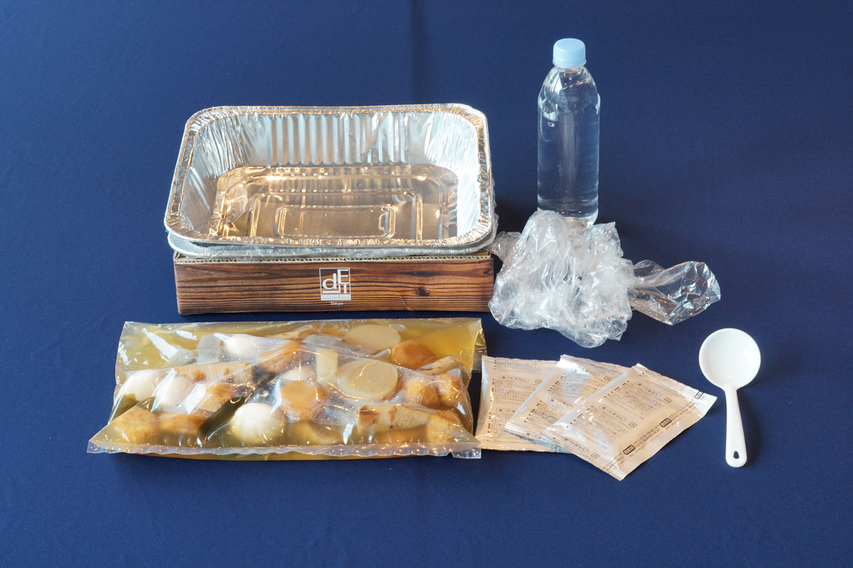おでん7種類各5個(ちくわ,さつまあげ,結びこんぶ,大根,こんにゃく,しらたき,たまご)、ねりからし5個、使用説明書、アルミ容器 2枚、ビニールカバー 2枚、発熱剤 3枚、ダンボール容器 1個、水ペットボトル 1本、紙ボウル皿、割り箸 各10セット、使い捨ておたま 1本