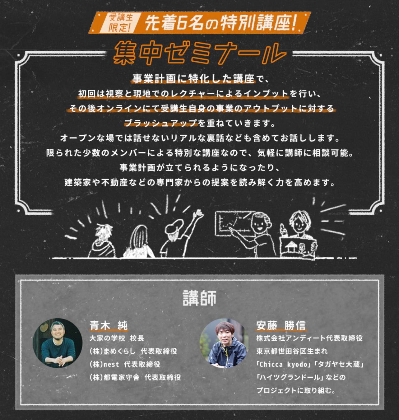 初回は視察と現地でのレクチャーによるインプットを行い、2回目からはオンラインにて受講生自身の事業のアウトプットに対するブラッシュアップを重ねていく、事業計画に特化した特別講座「集中ゼミナール」を開催します。先着6名の少人数制の講座です。講師は、大家の学校 校長の青木純。そして、古い建物を新たな価値ある場に再生し、住まい手の愛着や地域のつながりを育んでいる、株式会社アンディート代表取締役の安藤勝信氏が務めます。初回の視察では、安藤氏が拠点とする世田谷・経堂などでの視察を行います。限られた少数のメンバーによる特別な講座なので、オープンな場では話せないリアルな裏話なども含めてお話しします。気軽に講師への相談も可能です。自身の取り組みのコンセプトや強みを明確にし、事業計画を立てられるようになったり、建築家や不動産などの専門家からの提案を読み解く力を高めます。