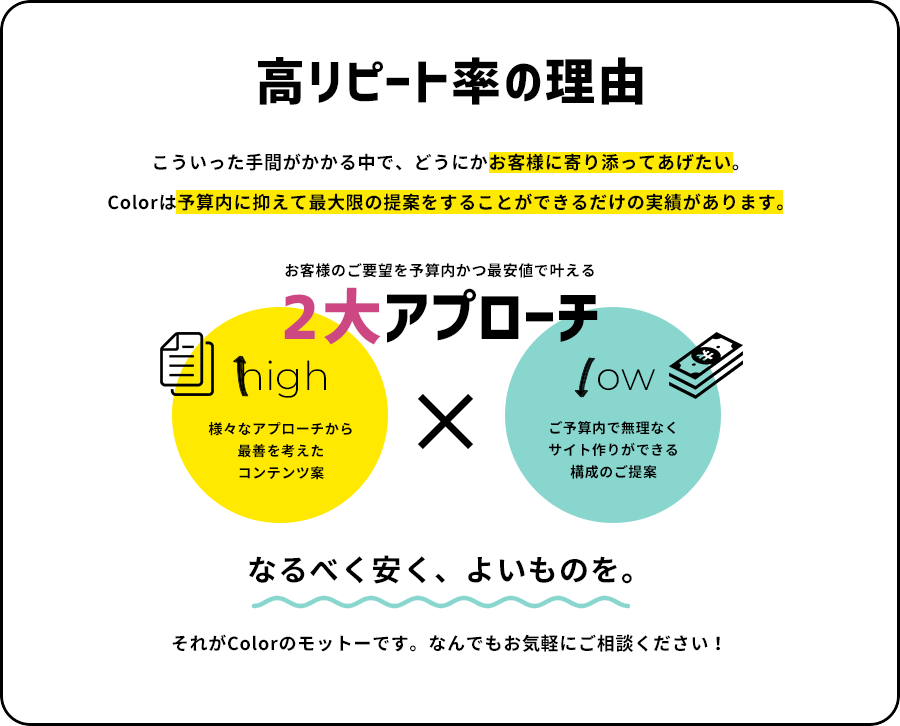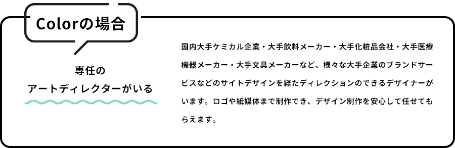 Colorは20年余りの実績のある専任のディレクターがいます。そのため、デザインやコンテンツの引き出しが多いのです!あなたのお考えをお話しいただくだけで適切で高品質なデザインを設計します。