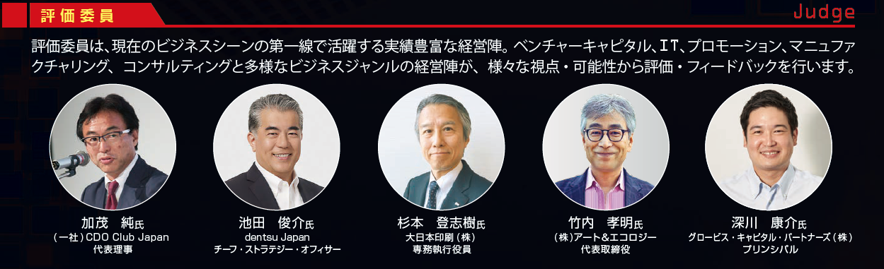 評価委員は、現在のビジネスシーンの第一線で活躍する実績豊富な5名。ベンチャーキャピタル、IT、プロモーション、マニュファクチャリング、コンサルティングと多様なビジネスジャンルに長けた評価委員が、様々な視点・可能性から評価・フィードバックを行います。
