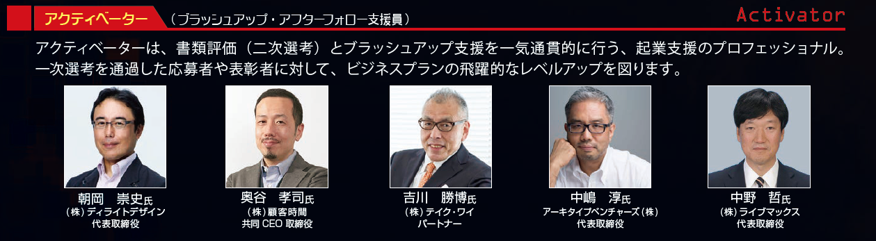 アクティベーターは、二次書類評価とブラッシュアップ支援を一気通貫的に行う、起業支援のプロフェッショナル5名。二次書類評価を通過した応募者に対するブラッシュアップ支援や、ファイナルイベントでの表彰者に対するアフターフォローなど、ビジネスプランの飛躍的なレベルアップを図ります。