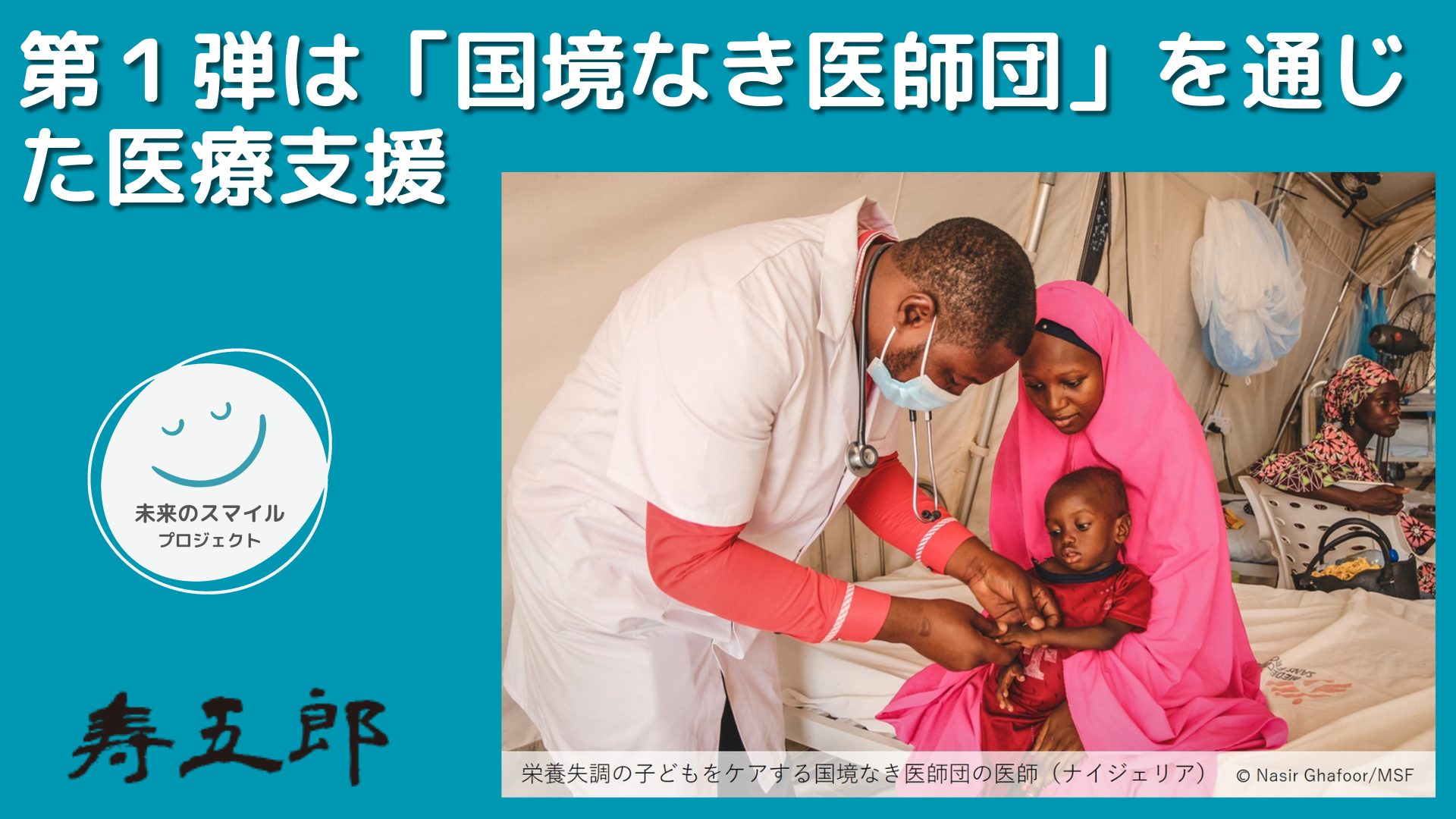 寿五郎が実施する薬剤師の人材紹介事業は、多くの医療機関や医療従事者の方々の支えなしには実現することはできません。「未来のスマイル」プロジェクトの第1弾では、薬剤師の多くが薬局や病院で働いていることから、私たちの事業と関連する医療領域においても社会的な影響を持つ活動に貢献したいと考えました。このため、寿五郎は収益の一部を、世界中で最も脆弱な地域に医療スタッフと資源を送り込んでいる医療従事者団体「国境なき医師団」に対して支援することを決定いたしました。