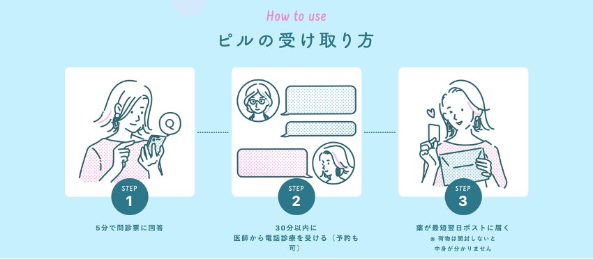 ピルの処方にあたって予約は必要ありません。オンラインで問診票に回答したら、30分以内に医師のオンライン診察を受けられます。月2,330円(税込2,563円)から始められて、続けやすいのもポイントです。