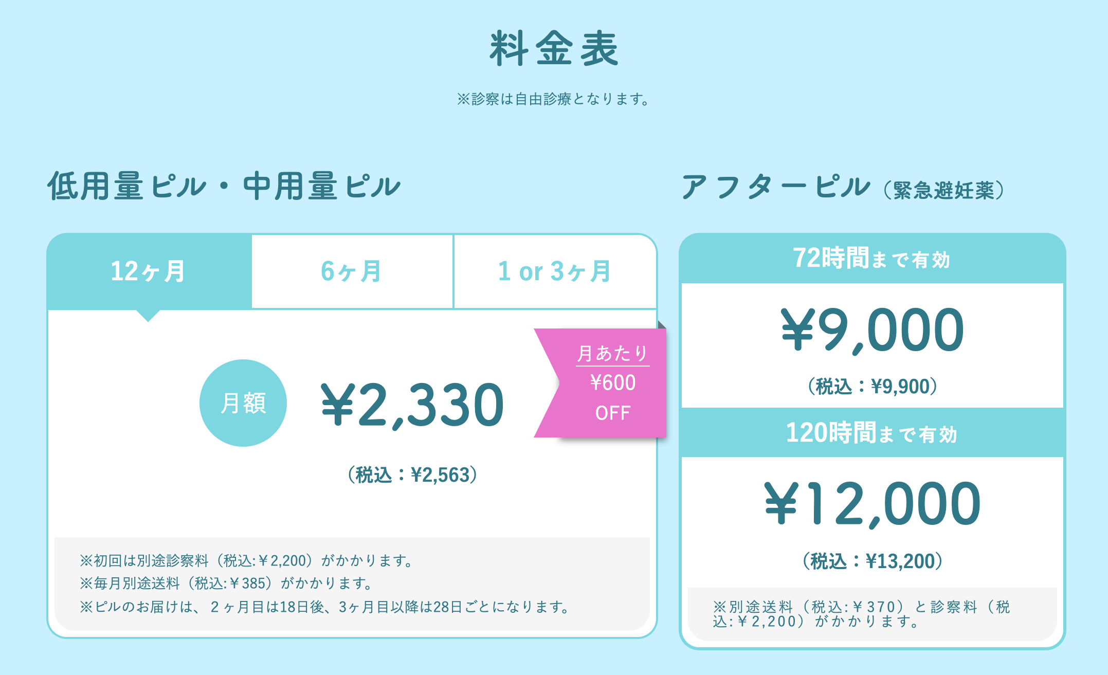 低用量ピル・中用量ピル:月額2,330円(税込2,563円)から